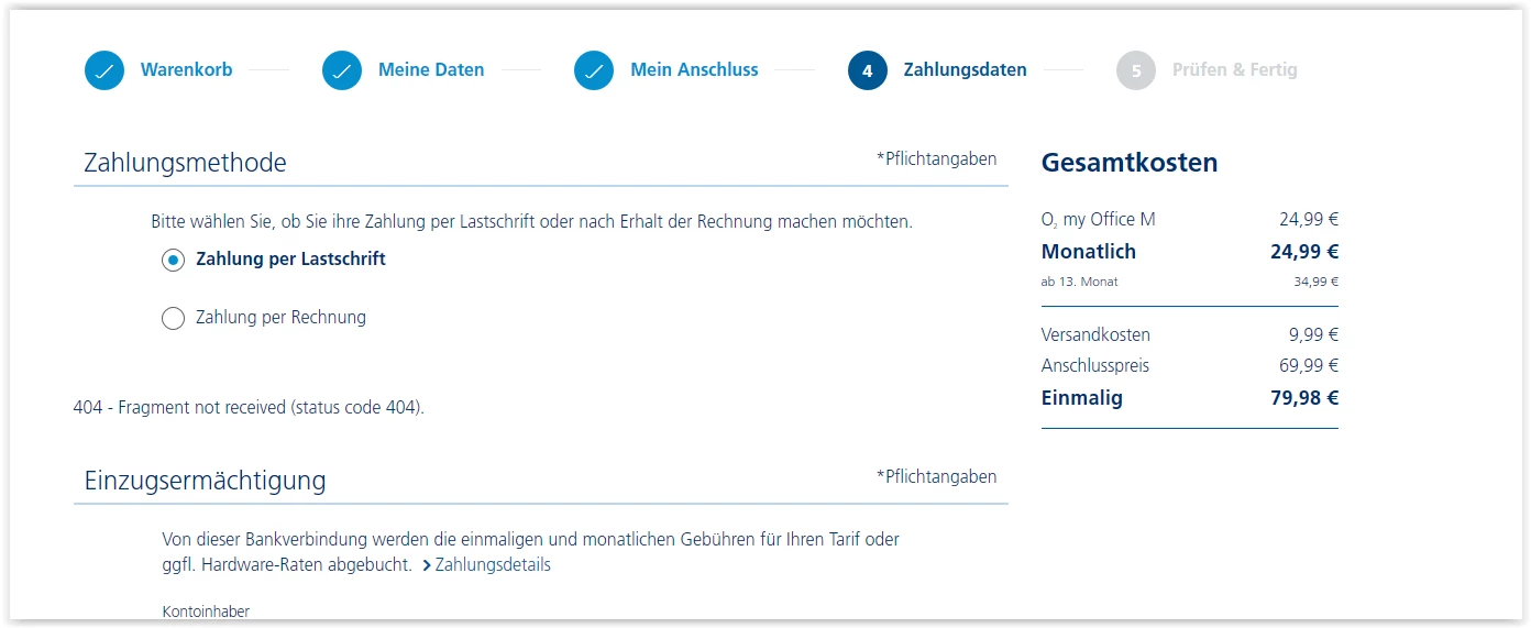 Ich wollte heute für einen Verein o2 DSL für Selbständige bestellen. Leider gibt es auf der vorletzten Seite einen 404 Fehler angezeigt und danach ist die Bestellung nicht durchführbar.