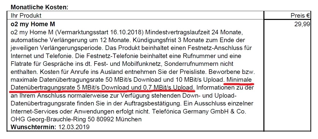 gern habe ich einmal für dich nachgesehen. Es ist so, dass du bei den Produktbestandteilen zu deinem o2 My Home M eine maximale und eine minimale Datenübertragungsrate angegeben findest. Die maximale Datenübertragungsrate liegt bei 50 MBit/s im Download und 10 MBit/s im Upload. Die Minimale Datenübertragungsrate beträgt 5 MBit/s im Upload und 0,7 MBit/s im Download.