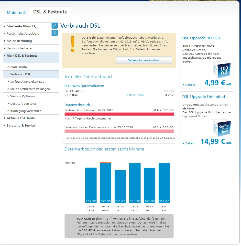 die Fair Use Mechanik sieht laut FAQ vor, dass die Surfgeschwindigkeit gedrosselt wird, sobald drei Monate in Folge das Datenvolumen überschritten wurde. Wir unten zu sehen, ist dies hier nicht der Fall. Dennoch wird die Surfgeschwindigkeit reduziert. Das ist sehr unangenehm und für mich so nicht hinnehmbar.