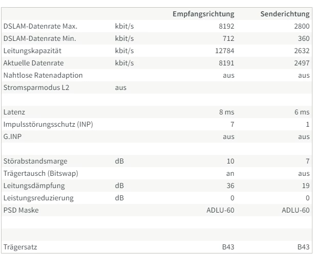 Möglich wären max 12.436 kbit/s, dabei wäre die Leitung aber zu instabil, daher hat uns der lokale Provider -der immer eher konservativ schaltet- diese nicht zur Verfügung gestellt.