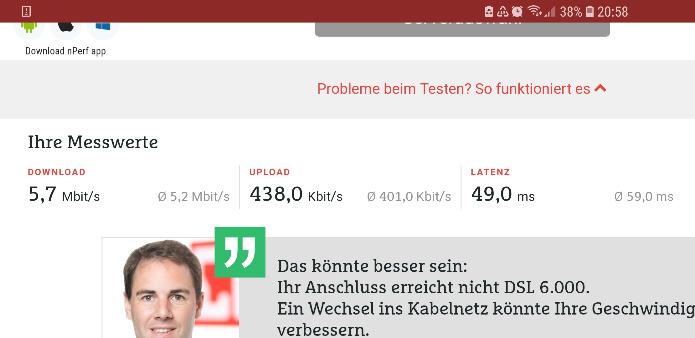 ok , für nen 50MB Anschluss sind die Werte selbst im W-Lan inakzeptabel. Das sieht nach ADSL Anschluss aus , hat die Hotline denn schon mal nen Techniker vorbei geschickt ? Hast du zufällig ne Fritzbox als Router  , mich würden mal die Synchronisationswerte und die Dämpfungswerte interessieren.VDSL  scheint bei den Werten jedenfalls nicht anzuliegen