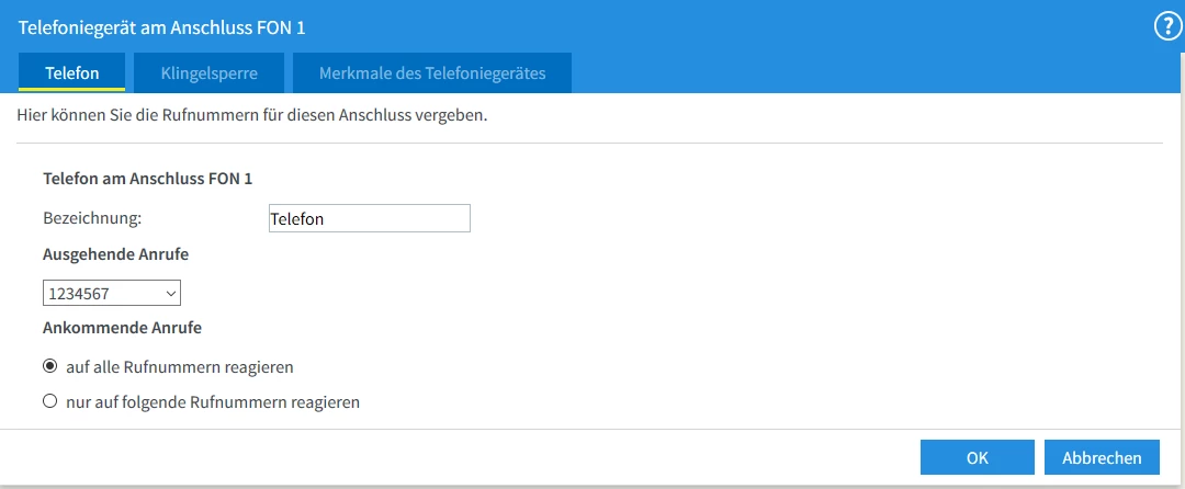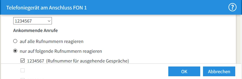 Und das Telefon am Anschluss FON 1 Ruft mit 1234567 raus und klingel auch nur bei dieser.