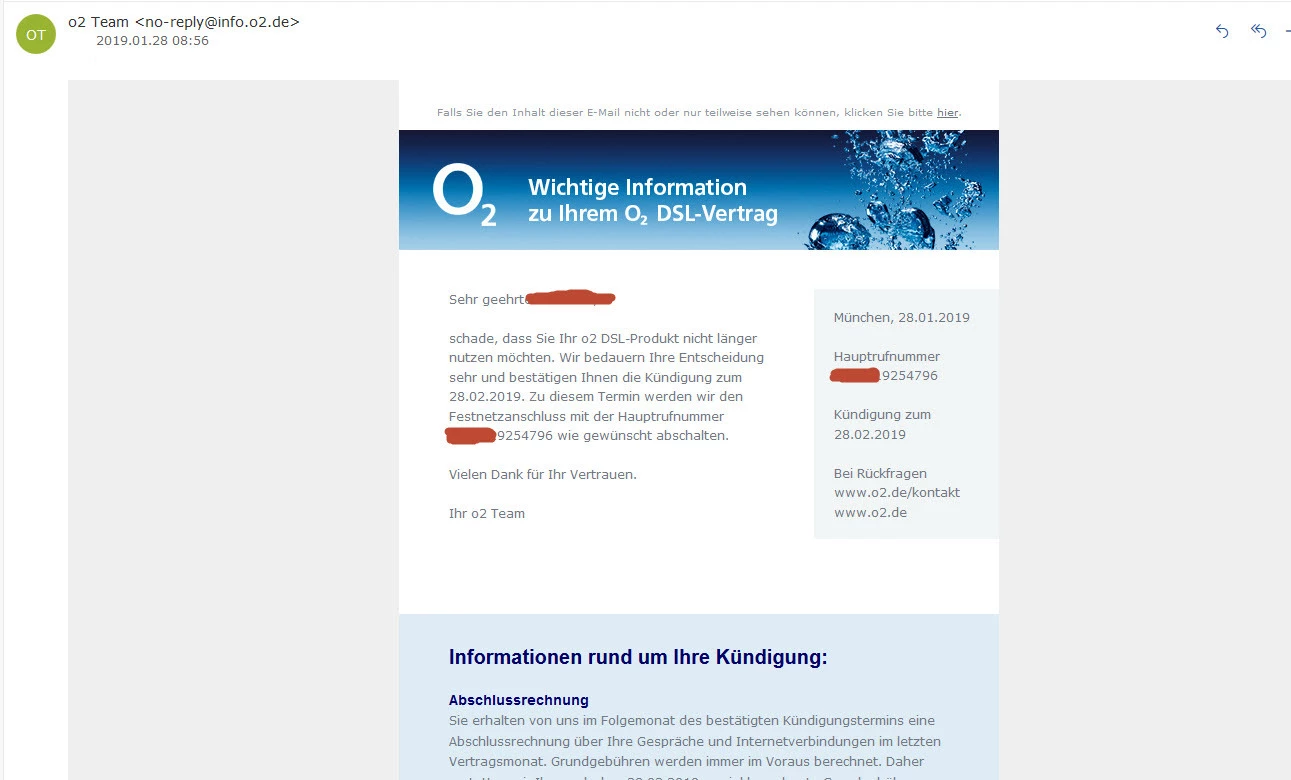 Hallo, laut Kündigungsbestätigung (siehe unten) sollte mein DSL Vertrag zum 28.02.2019 beendet. Der Anschluss ist aber immer noch nicht deaktiviert.
