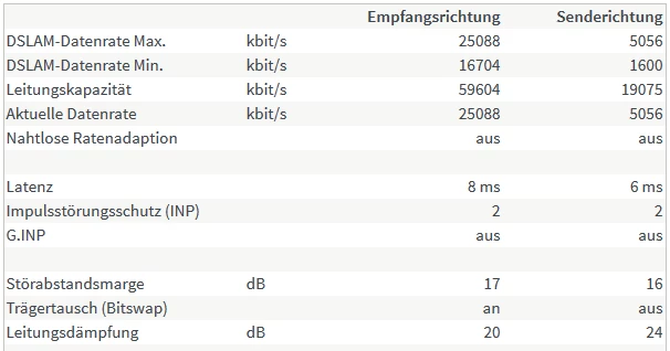 Die neue Verbindung ist sogar etwas besser als die alte, die die 50kbit nur knapp schaffte. Jetzt hätte ich mit 59kbit Leitungskapazität sogar eigentlich noch etwas Reserve.