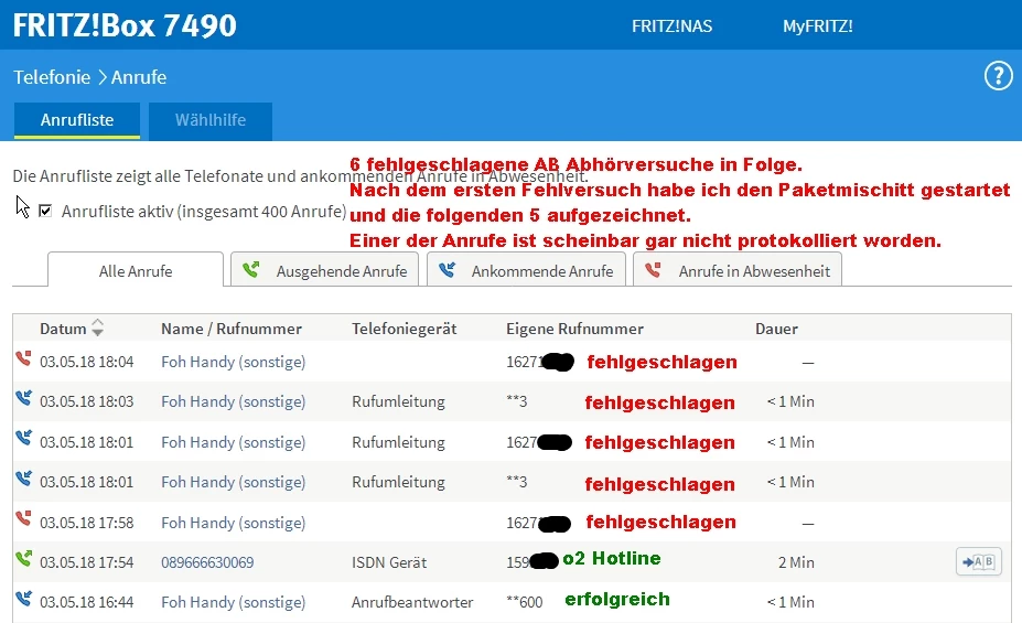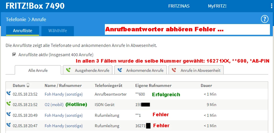 In Screenshot-1 ist zu sehen, dass die AB Abhör-Anrufe zwischen 17:58 und 18:04 angenommen wurden, trotz Sperre, und nicht erfolgreich waren (vielleicht wegen der Sperre??) ... aber die Box hat ja schon die Kennung des angewählten Geräts falsch verstanden!