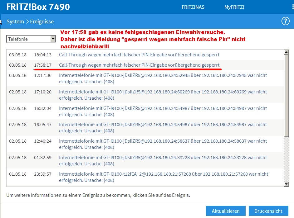 Statt einem korrekten Protokoll, oder einer Benachrichtigung, dass (angeblich) eine falsche Pin eingegeben wurde, sperrt die FritzBox einfach den Zugang, wenn innerhalb einer Stunde 3x eine falsche Pin eingegeben wurde.