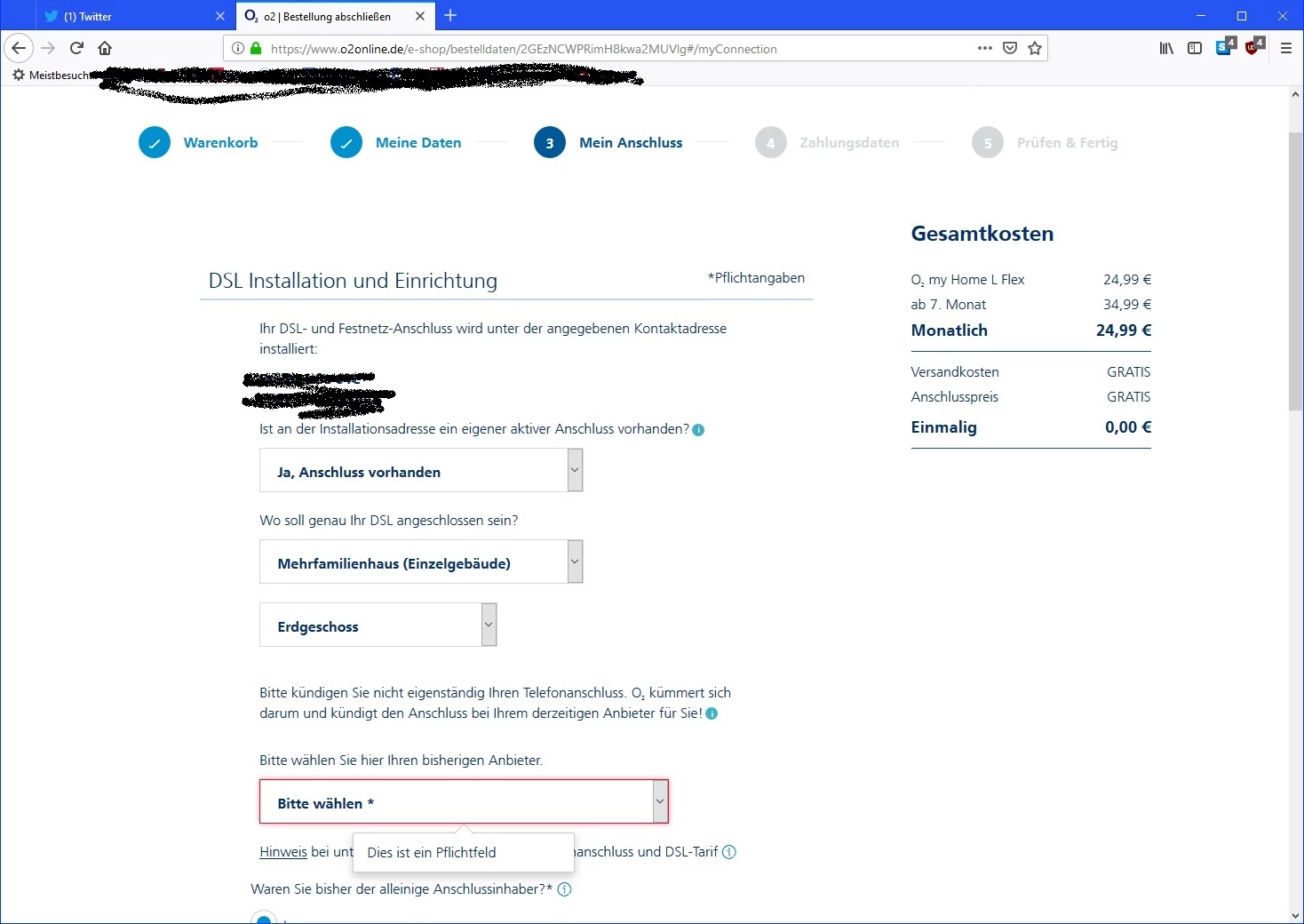 Also in den Warenkorb damit und 'Zur Kasse'. Hier komme ich aber nur bis zu "Mein Anschluss", da steht zwar schon meine Adresse, trotzdem muss ich auswählen ob ein Anschluss vorhanden ist (klar, sogar einer von O2) und in welchem Stockwerk ich wohne. Tja, und dann muss ich auswählen, wer mein bisheriger Anbieter ist - und O2 steht nicht in der Auswahlliste. Ohne Auswahl gehts aber nicht weiter.