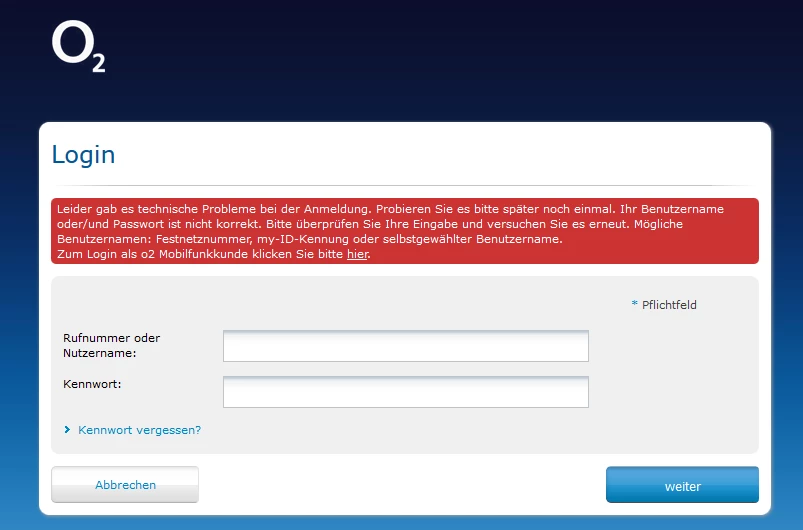 Nachdem ich meine Festnetznummer und mein Passwort eingegeben habe, kommt folgende Fehlermeldung. Auch wenn ich auf Kennwort vergessen klicke bekomme ich selbige Fehlermeldung?