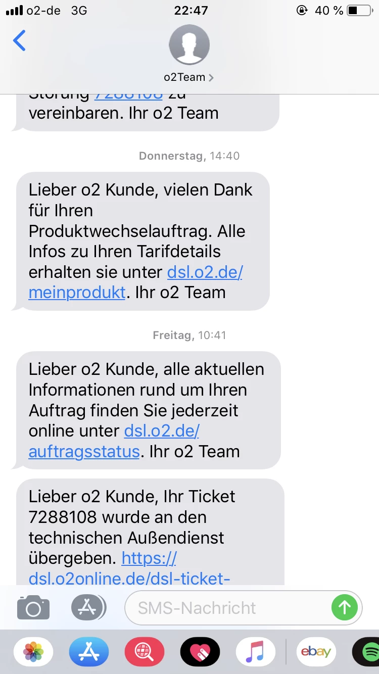 Wie dem auch sei, am Montag oder Dienstag vorige Woche dann nochmal Hotline angerufen: Der gute Herr am Telefon sagte mir, es wurde das Problem von außerhalb behoben. Ist wohl ein Portfehler.Dennoch zeigt meine Fritzbox 7490 mit neuester Software das gleiche Problem wie vorher: PPPoE bla bla bla. In dem Telefonat habe ich erneut einen Termin gemacht, für heute, den 29.10., allerdings ging Freitag - warum auch immer - das Internet. 1 Stunde. In dieser Stunde habe ich den Termin für heute abgesagt und das Ticket geschlossen. Nach der Stunde ging das Internet nicht und das Ticket war auch geschlossen. Heute gg. 13 Uhr habe ich nochmal angerufen, öffnen eines neuen Tickets verlangt. Bisher habe ich diesbezüglich keine SMS erhalten. Allerdings am Donnerstag eine Nachricht auf ProduktwechselAntrag bekommen, welches ich nie in Auftrag gegeben habe, da würde ich mich auch über Info freuen, wieso weshalb und warum.