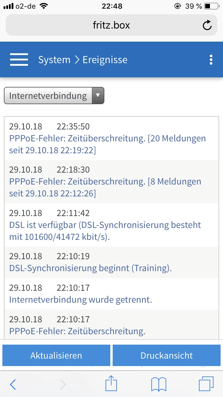Von Anfang an ging ab da meine Internetverbindung nicht. Fehlermeldung lautet: PPPoE Fehler: Zeitüberschreitung.