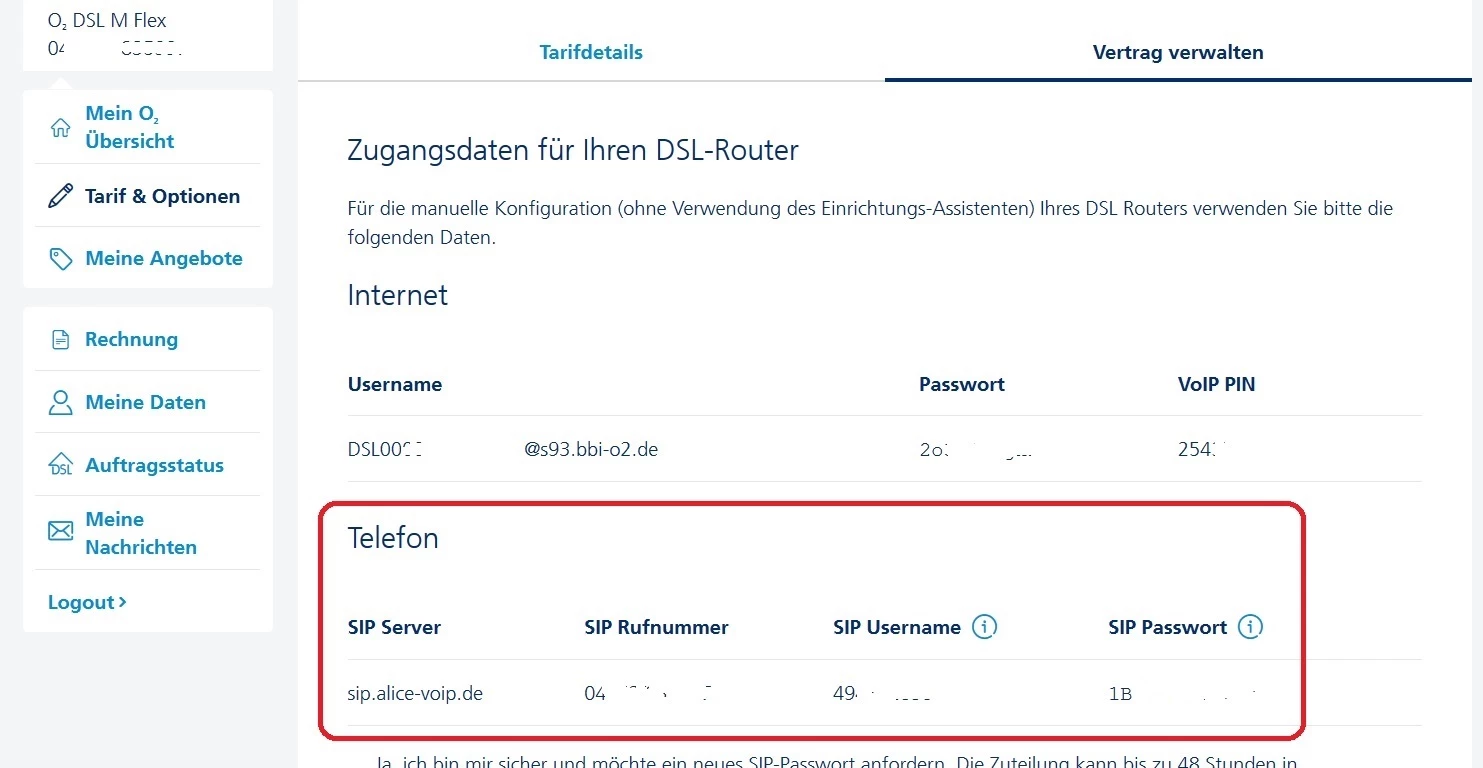Dann hängt dein Kundencenter sicherlich noch in Freischaltung. Sobald Du die Email von O2 bekommen hast, dass dein Anschluss komplett geschaltet ist, kommst Du an deine kompletten SIP Zugangsdaten über das Kundencenter.
