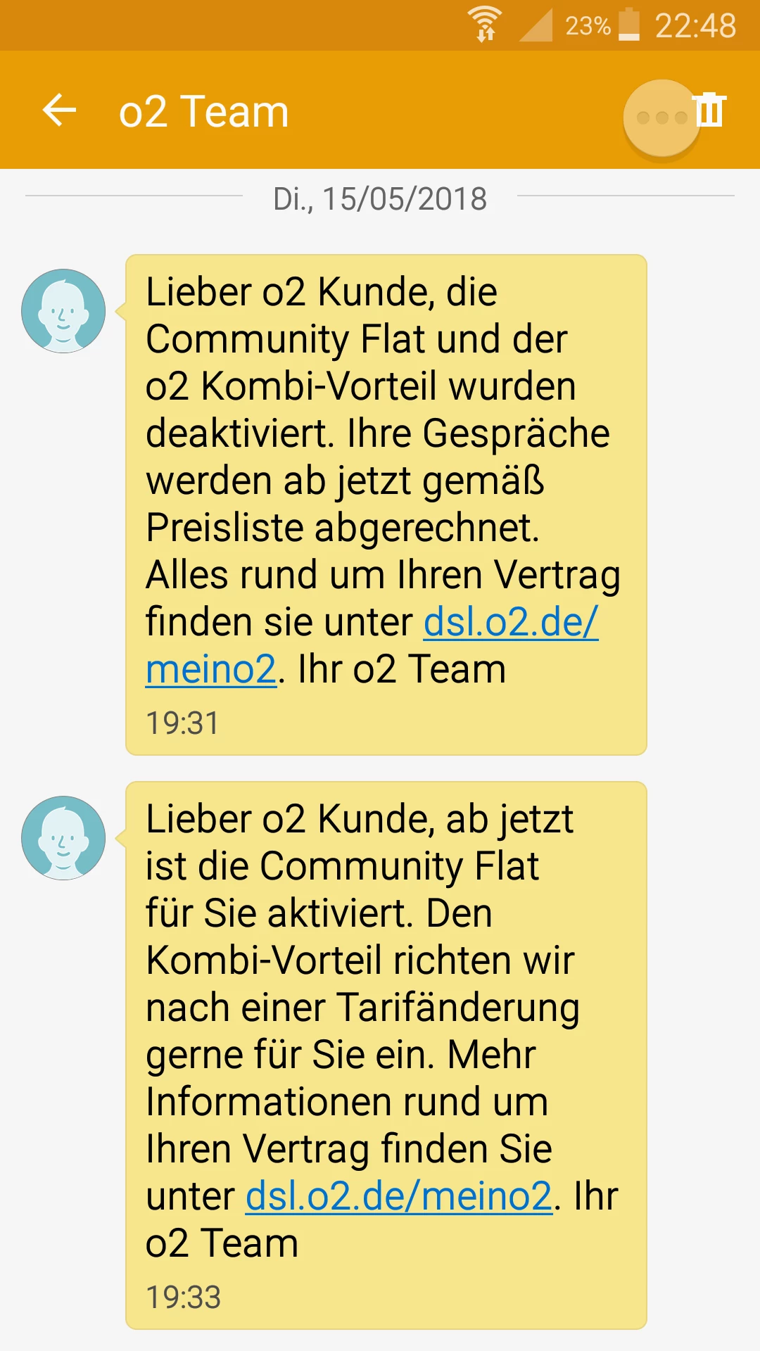 In der zweiten SMS wurde dann die Community-Flat wieder aktiviert, jedoch nicht mehr der Kombi-Vorteil auf den DSL-Vertrag.