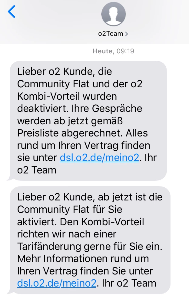 habe grade eine SMS erhalten, dass mein Kombi-Vorteil und die Community-Flat deaktiviert wurde. Es gab KEINE Tarifänderung oder sonstige Änderungen an den Verträgen!