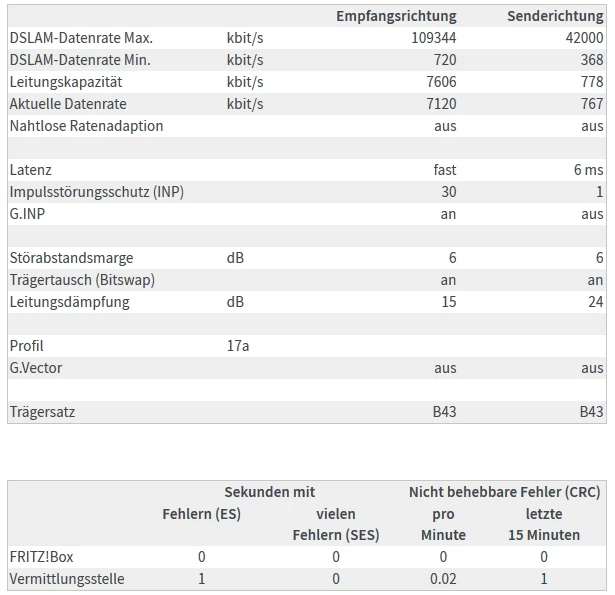 Ich komme mal direkt zur Leitungskapazität. Denn diese sagt, maximal 7 Mbit. Egal was also das Profil sagt, die Leitung möchte einfach nicht mehr als 7 Mbit hergeben. Genau hier scheint das Problem zu sein, die Leitung ist wohl defekt oder man hat falsch geschaltet. Denn bei dieser Leitungskapazität würde niemals ein VDSL Profil geschaltet, schon gar kein Vectoring mit 100 Mbit. Hier ist also das Problem und erfordert einen Techniker.