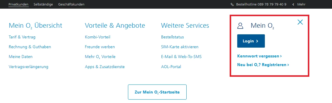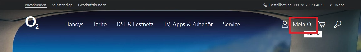 sofern du deinen Vertrag online bereits registriert hast, melde dich auf der Startseite oben rechts auf unserer Seite ein. Klicke dazu auf “Mein o2”