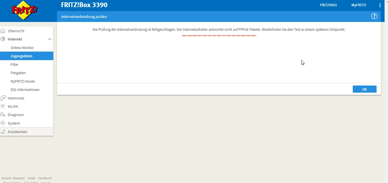 Hallo! Ich habe die Störungshotline angerufen. Ihre Kollegen haben mir gesagt, dass ich einen anderen Router brauche. Heute habe ich einen neuen Router angeschlossen, aber leider bekomme ich beim Verbinden die gleiche Fehlermeldung: "PPPoE-Fehler: Zeitüberschreitung"