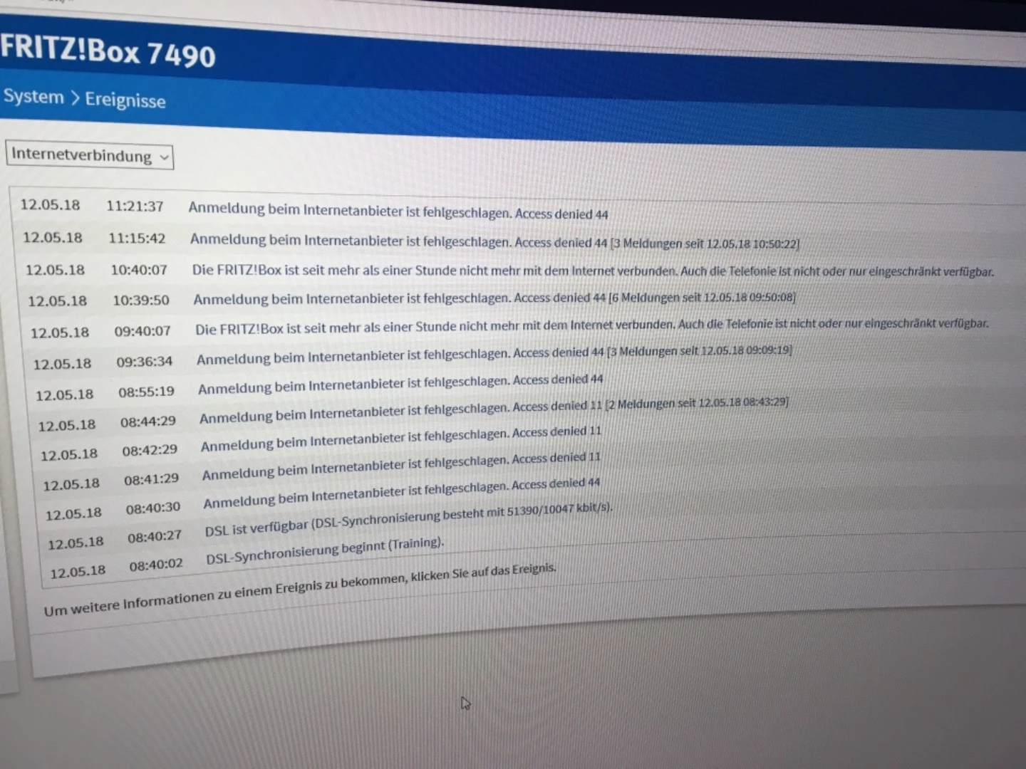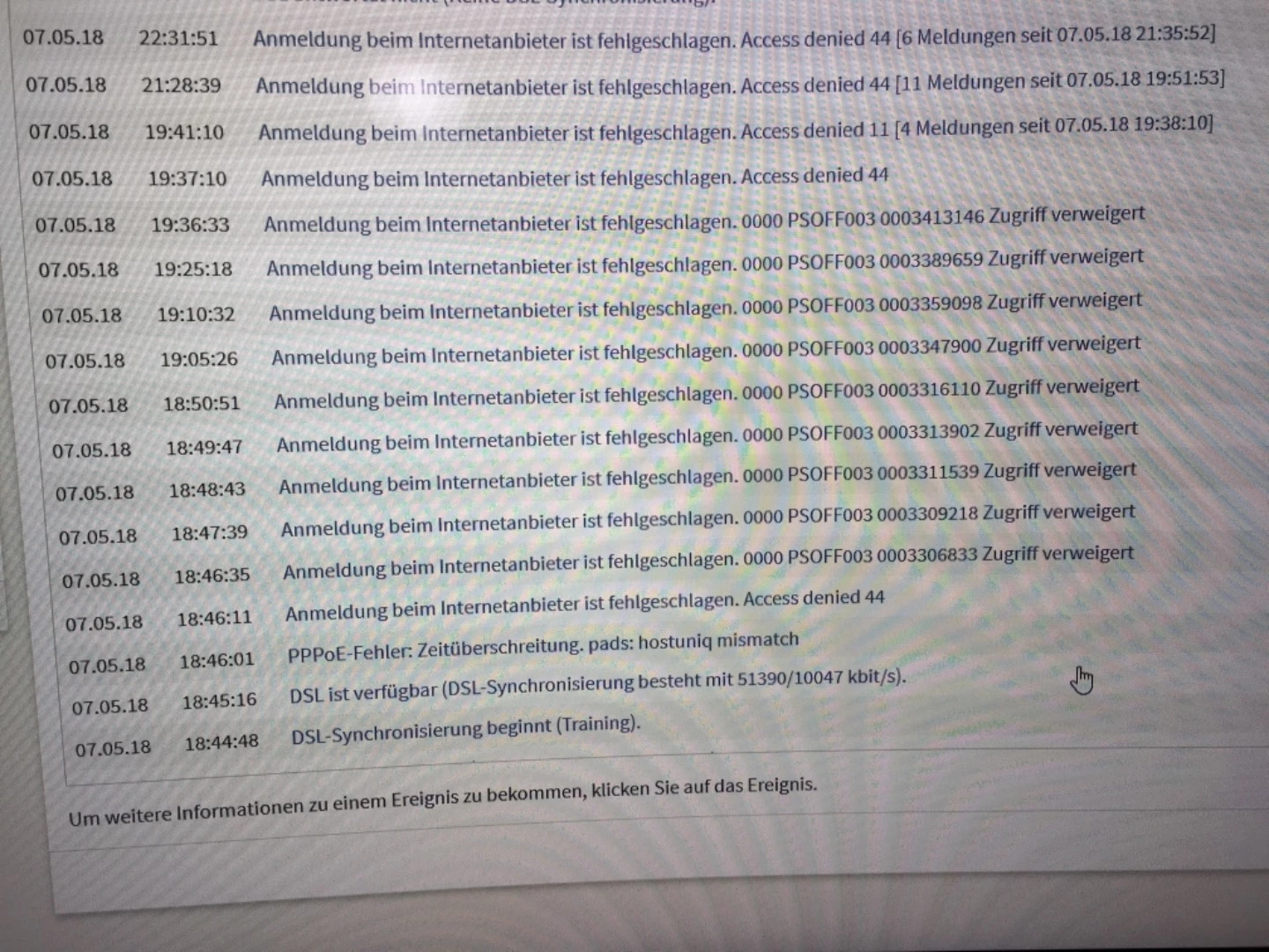 Was auch helfen kann wäre mal ein Foto vom System > Ereignisse dann Internetverbindung.