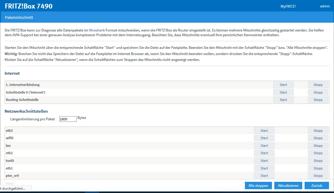 Und die Internetvebindung Mittschneiden? Wenn Du Start gedrückt hast dann eine 2. Seite aufmachen mit der Fritz.box Seite. Dann Internet -> Online-Monitor -> Neu Verbinden. Jetzt etwas 10 Minuten warten. Dann den Paketmitschnitt beenden.