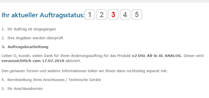 Nachdem der DSL-Auftragsstatus erst bei 5/5 angekommen ist sieht nun wie folgt aus: