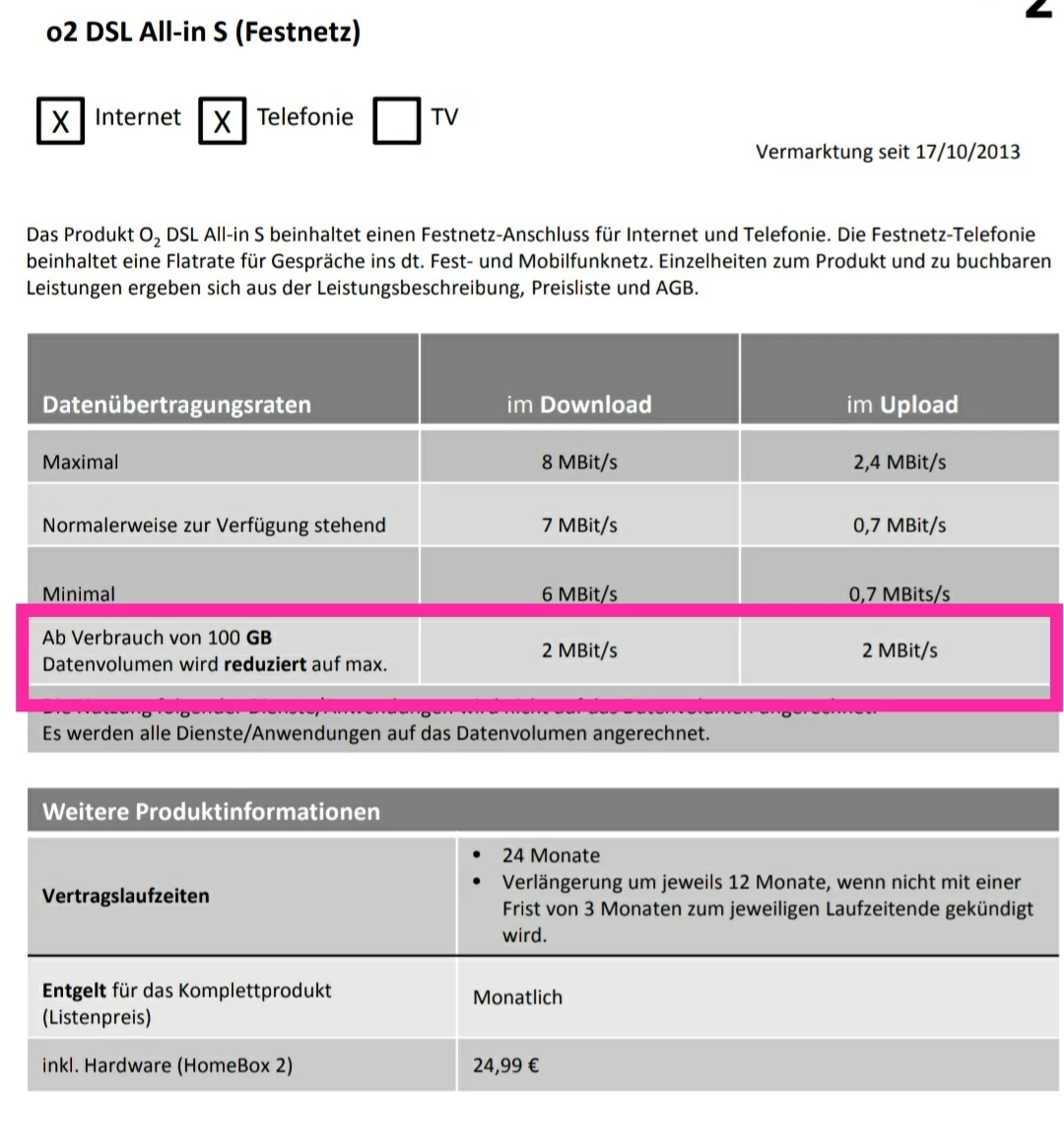 *bis zu 50 mbits , minimal 6. Und die Drossel ist raus. Die Anbieter sind dazu verpflichtet, dies transparent, schriftlich auf Produktinformationsblättern auszuweisen. Das hat o2 getan.