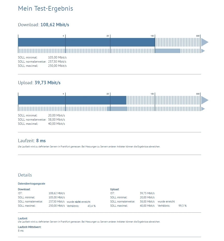 Ich bin von mein "o2 DSL All-in XL" auf das "o2 my Home XL" aufgestiegen und sollte ja 250MBit/s erhalten, aber erhalte gerade mal nur 112MBit/s. Ich damit absolute sehr unzufrieden, da es ja kaum schneller ist als mein alter Tarif, da würden sich ja die extra kosten im Monat für mich nicht lohnen.