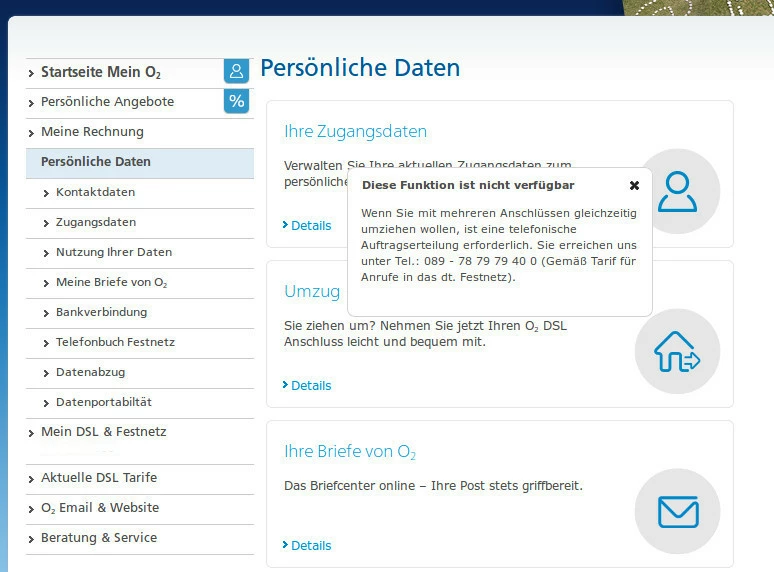 Mir ist aufgefallen, dass auch bei "persönlichen Daten" und "Ansachriften" ein Button "Umzug beauftragen" existiert. Wenn ich mit den Mauszeiger links über das zweite "Mehr Infos" gehe, dann erscheint die Anzeige "Mit Ihrem Produkt ist aktuell kein Umzug möglich".