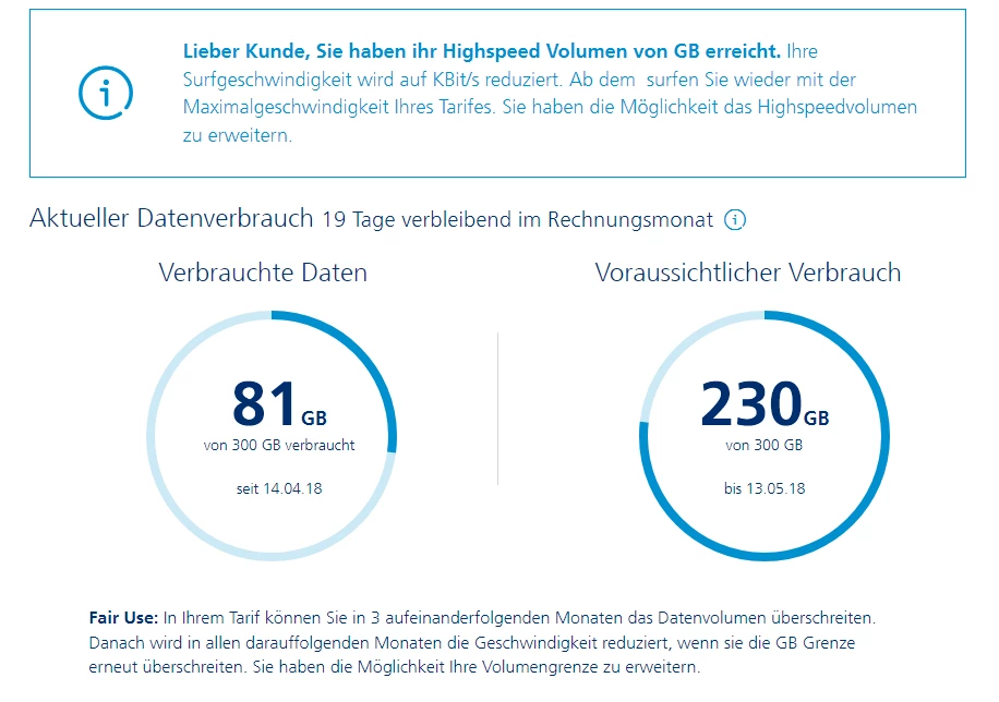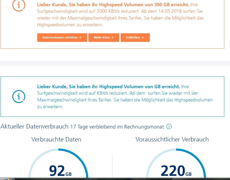 Also ich habe gemerkt, dass meine Verbindung plötzlich zu langsam (gedrosselt) ist. Wenn ich mich einlogge, dan sehe ich diesen Bild. Laut Zähler erst 92GB von 300 verbraucht.