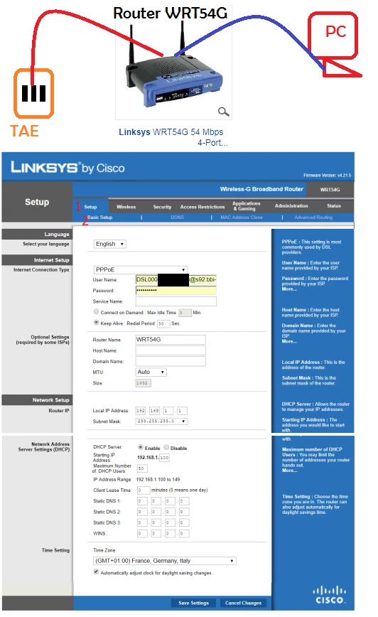 ich habe TAE-Anschlussdose mit Linksys Router "WRT54G" via DSL-Kabel direkt verbunden und der Router mit meinem Laptop via LAN-Kabel verbunden.