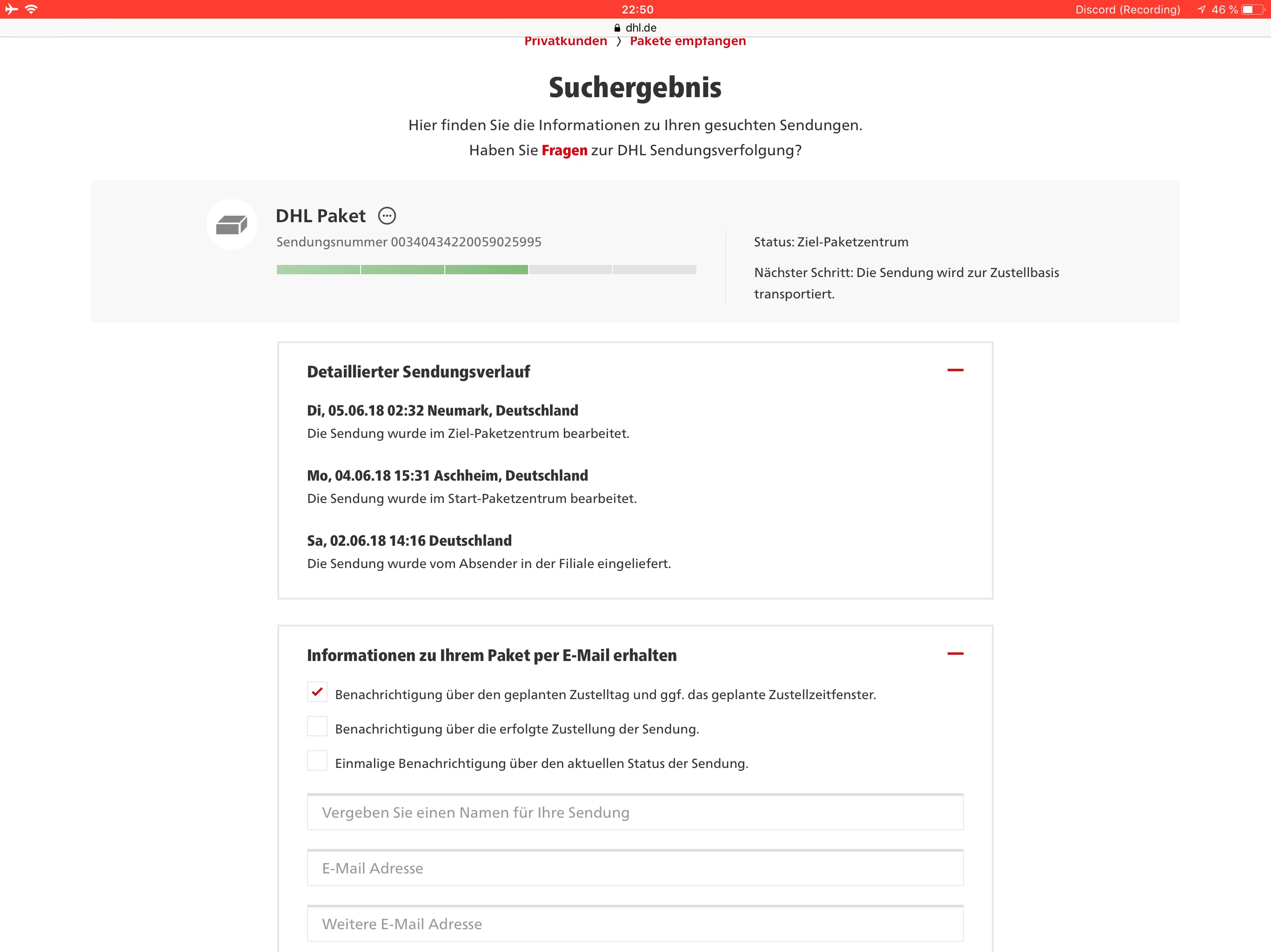Dann musst du selbst eine Nachforschung bei DHL beantragen.