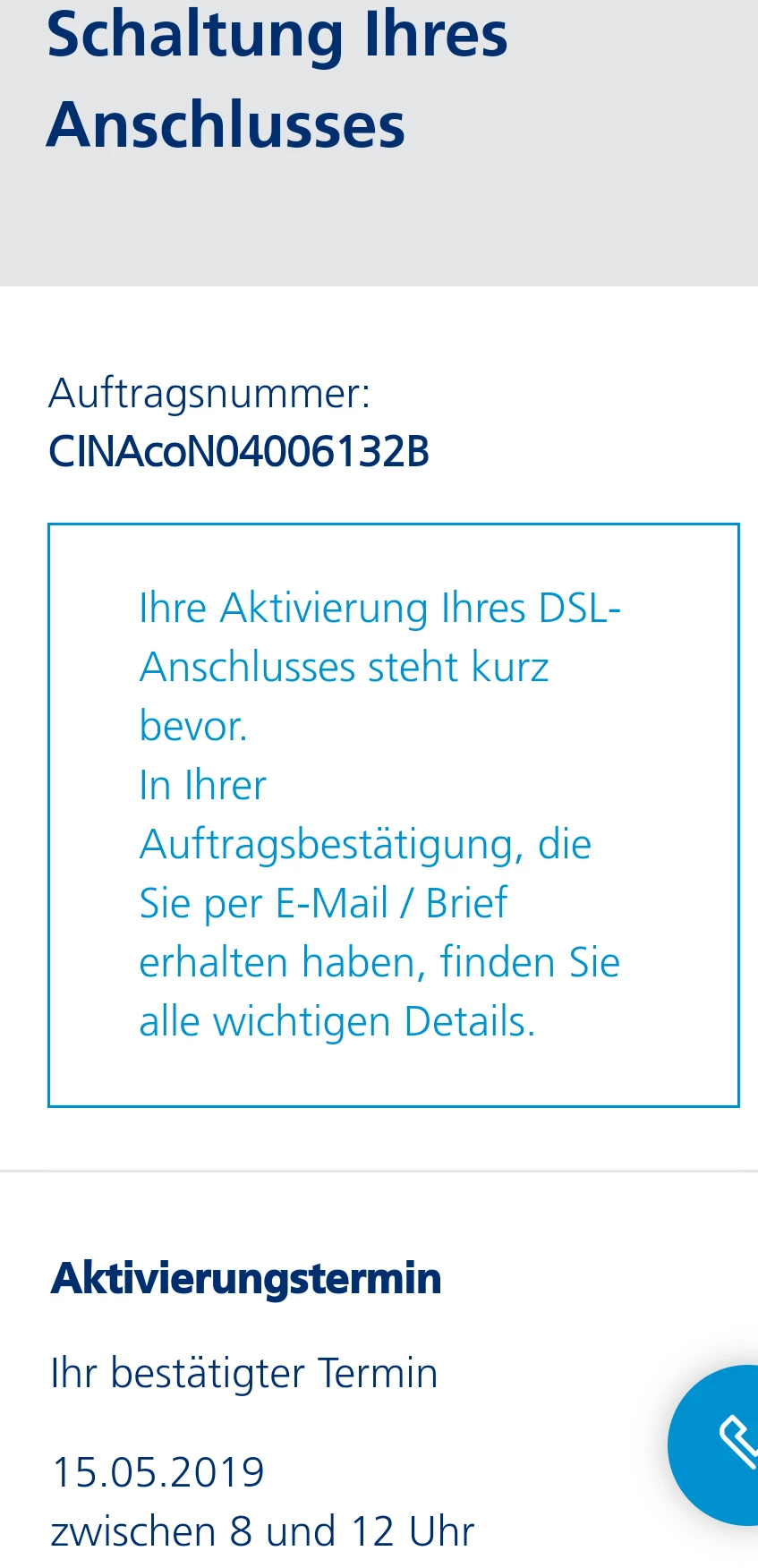 Der Anschluss sollte am 15.05.19 zwischen 08-12 Uhr freigeschaltet werden.