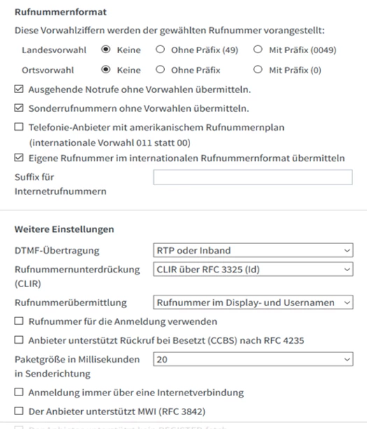 Hier die Einstellung meiner Fritzbox. Die Felder "Eigene Rufnummerübertragung im internationalen Format übermitteln" und "Rufnummerübermittlung" habe ich nachträglich aktiviert. Muss ich dass wieder rückgängig machen?