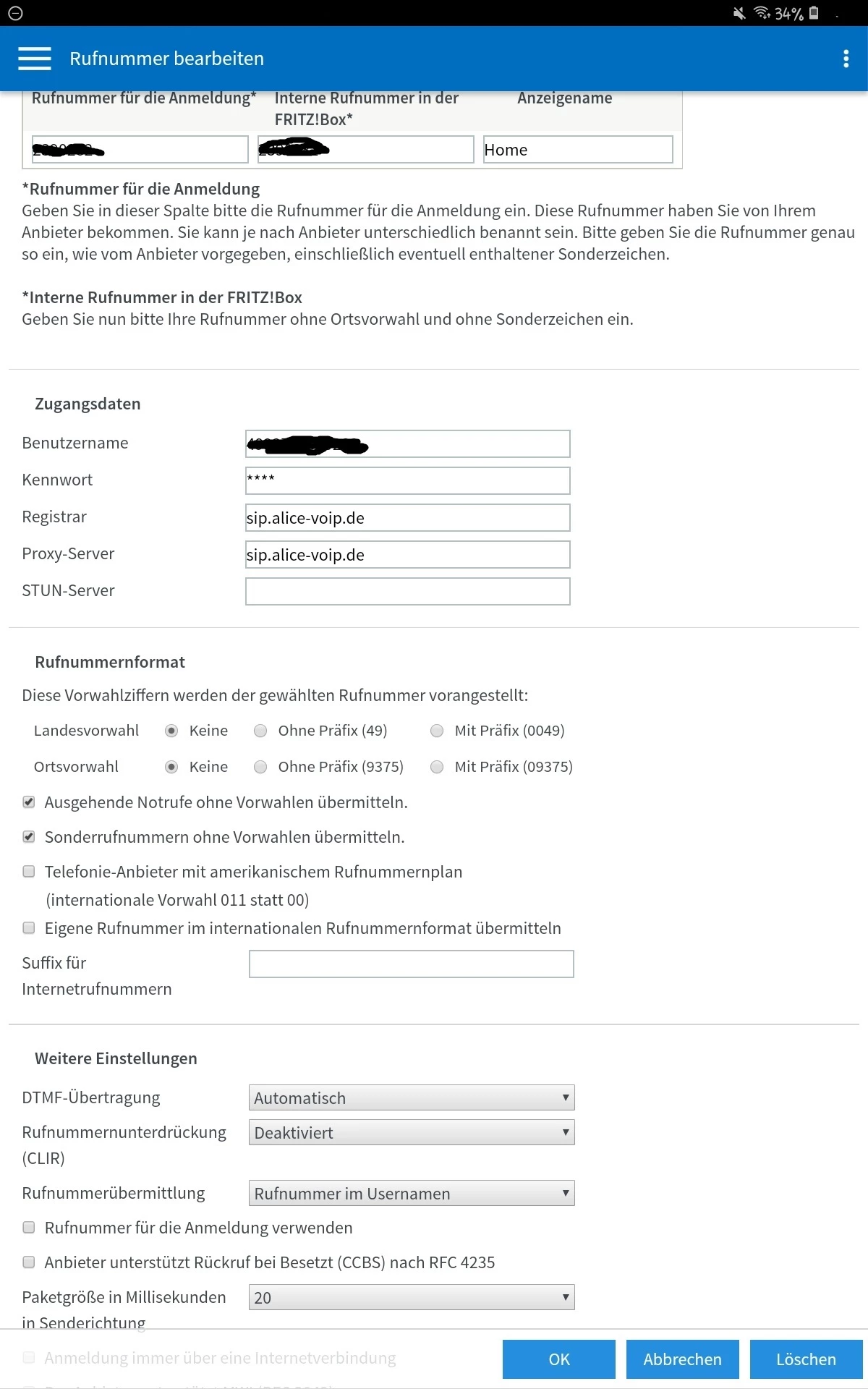 Und teilen Sie mir die richtigen Einstellung auf der AVM-FritzBox 7490 (nicht O2-Modell) mit.