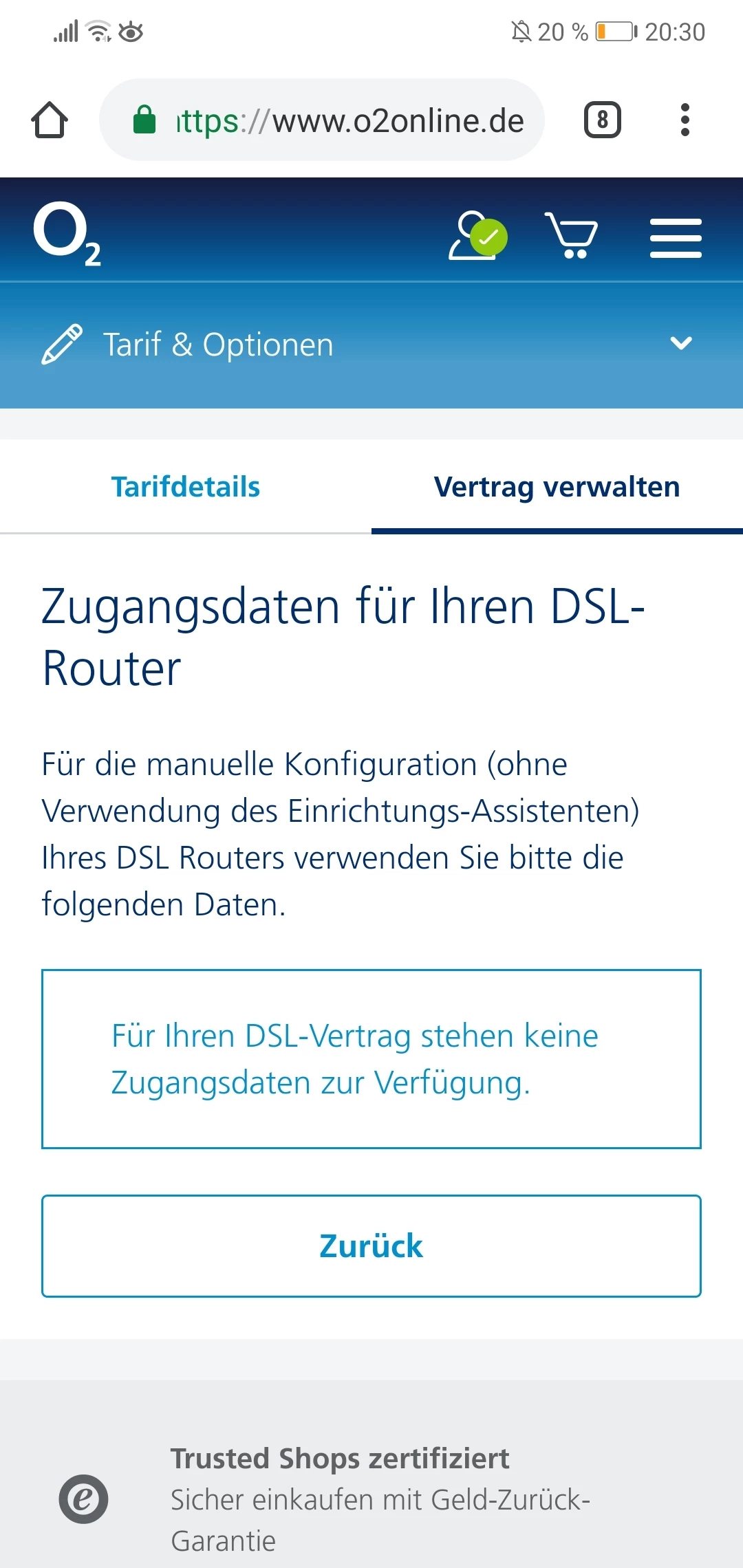 Seit Wochen sind online die Sip-Daten nicht abrufbar (für meinen Vertrag sind angeblich keine vorhanden, steht da...) Anschluss seit August freigeschaltet. Hotline vertröstet nur mit "probieren Sie es einfach in ein paar Tagen nochmal". Shop vor Ort, wo Vertrag abgeschlossen wurde, sagt, ich solle mich schriftlich an o2 wenden. Email Adresse gibt's aber nicht. Bei der Hotline komm ich auch nicht mehr durch...