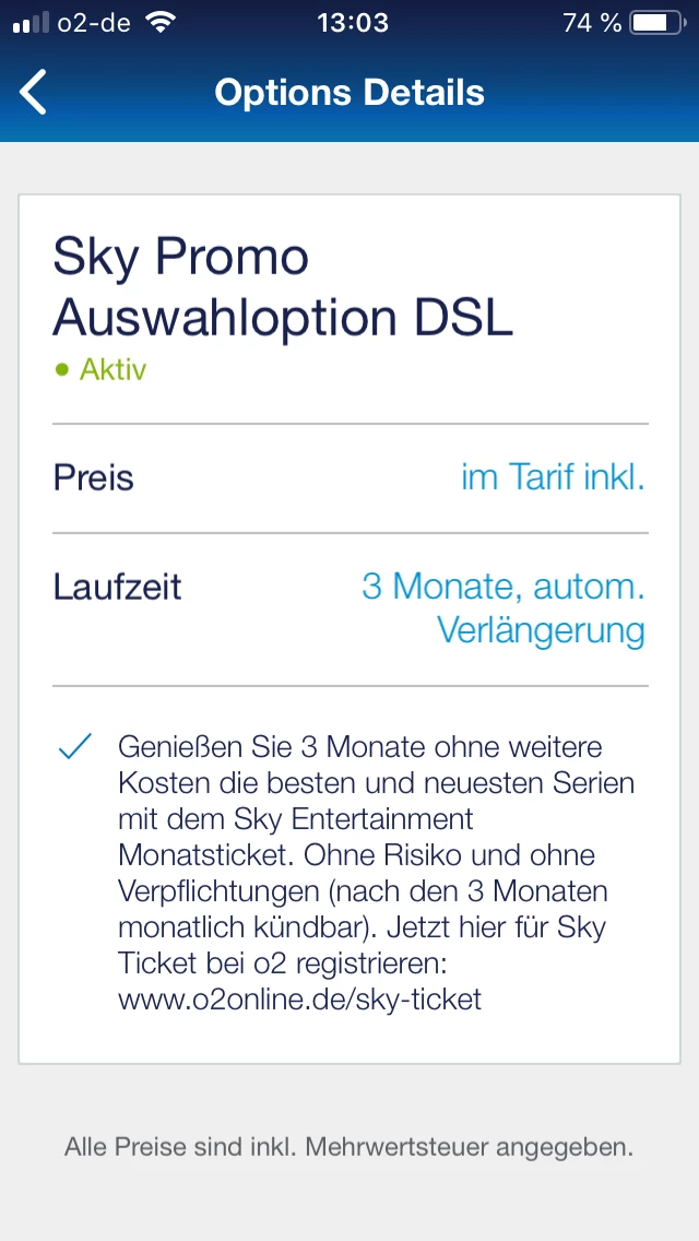 Hallo, in meinem o2 my Home M Vertrag wird die Sky Promo Auswahloption DSL als aktiv angezeigt.
