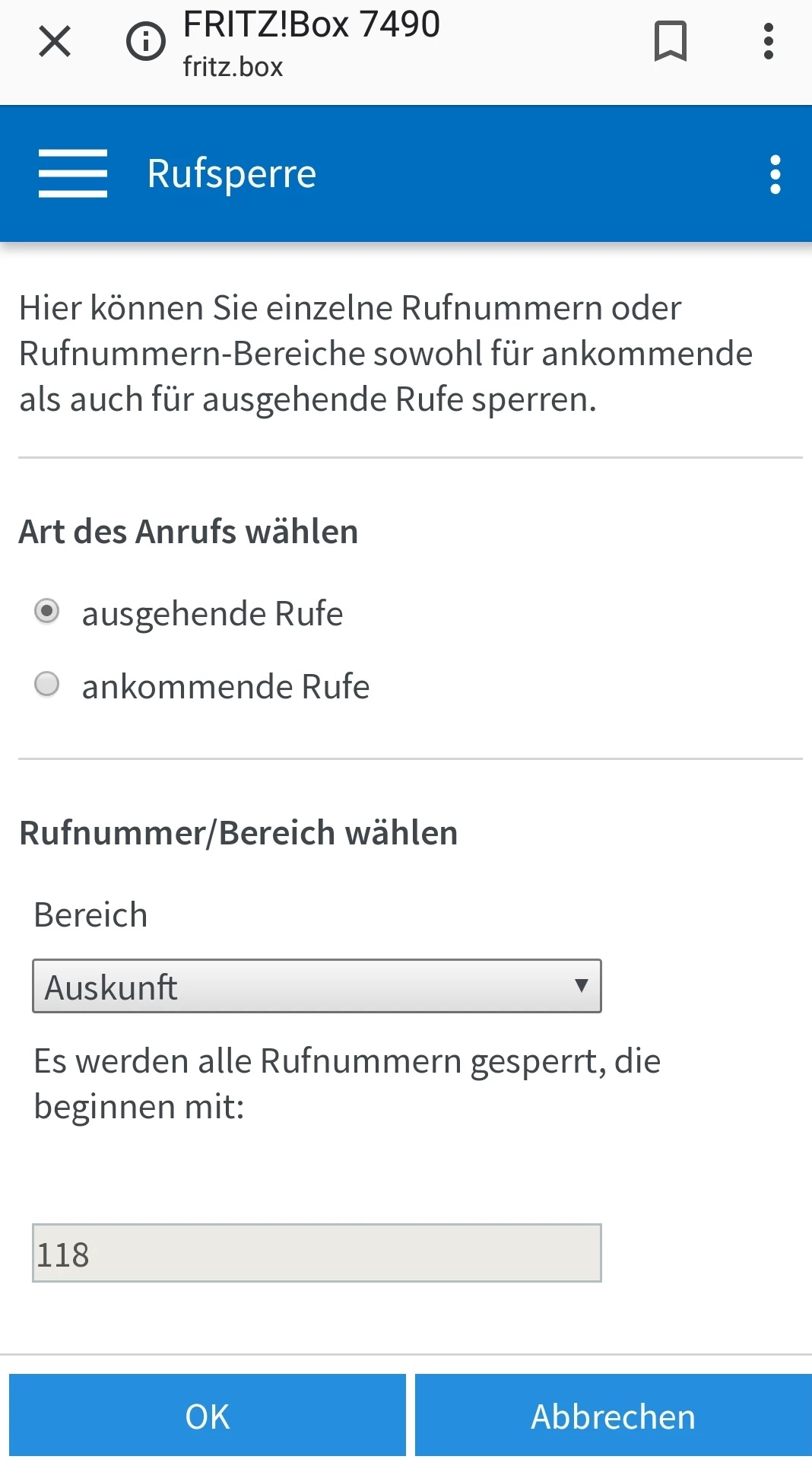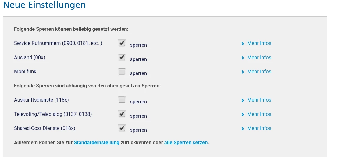 Sperrung von Sonderrufnummer wie Auskunft etc für Festnetz