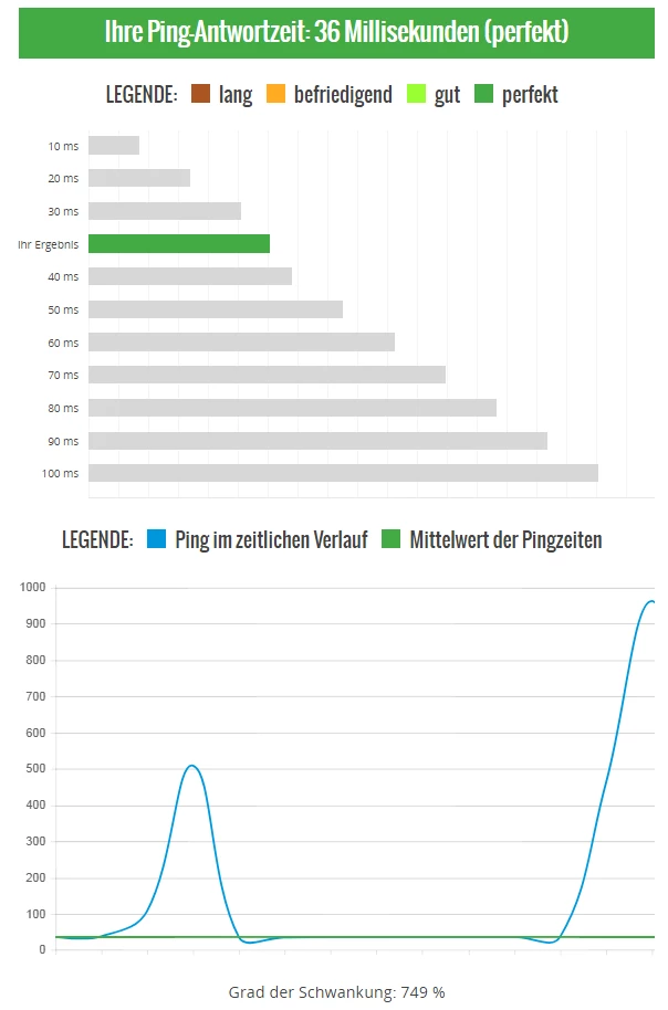 Meinen ping teste ich auch häufig auf https://www.wieistmeineip.de/ping/, da mir dieser Pingtest oft schöne Graphen zeigt, wie in den beiden Bildern – Wie ist meine IP Pingtest 1 und 2 – zu sehen ist.