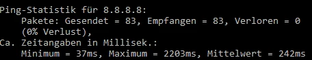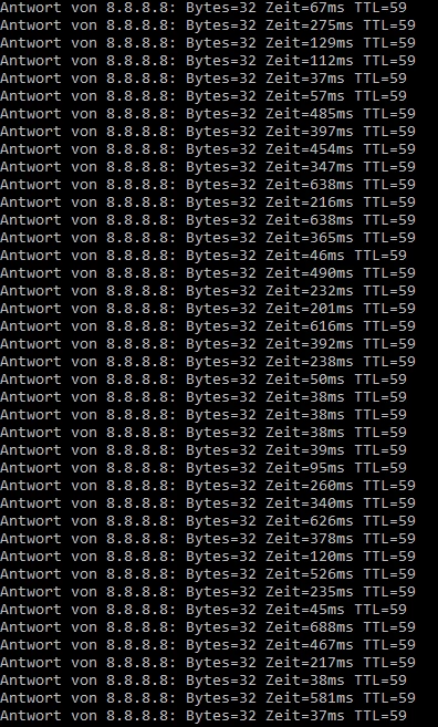 Zuerst der ping an meinen eigenen Router, den ich öfters wiederholt habe, der aber immer gleichbleibt. Bei diesem kann ich keinen Problem feststellen.