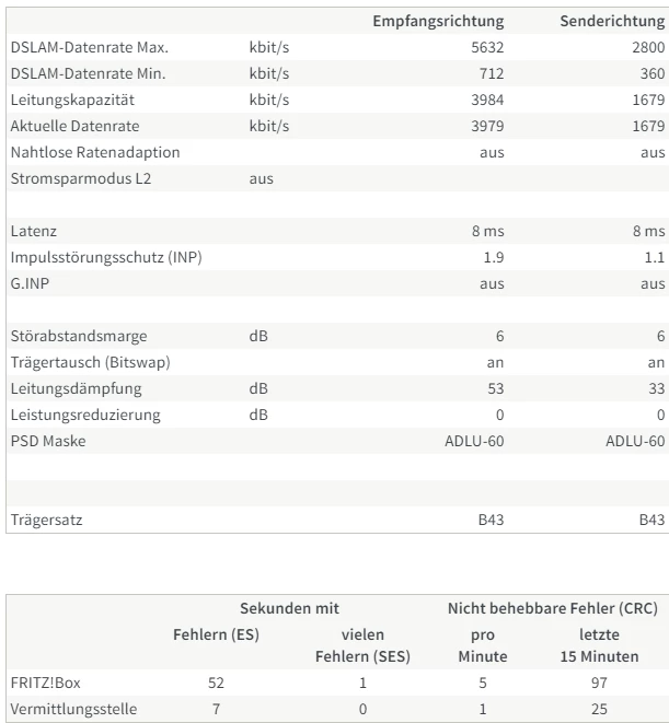 Die aktuelle Datenrate betrug vor ein paar Tagen noch ca. 5000kbit/s. Liegt es vielleicht an der Leistungskapazität, wenn ja wie kann ich sie auf das Datenraten Max von 5632kbit/s erhöhen?