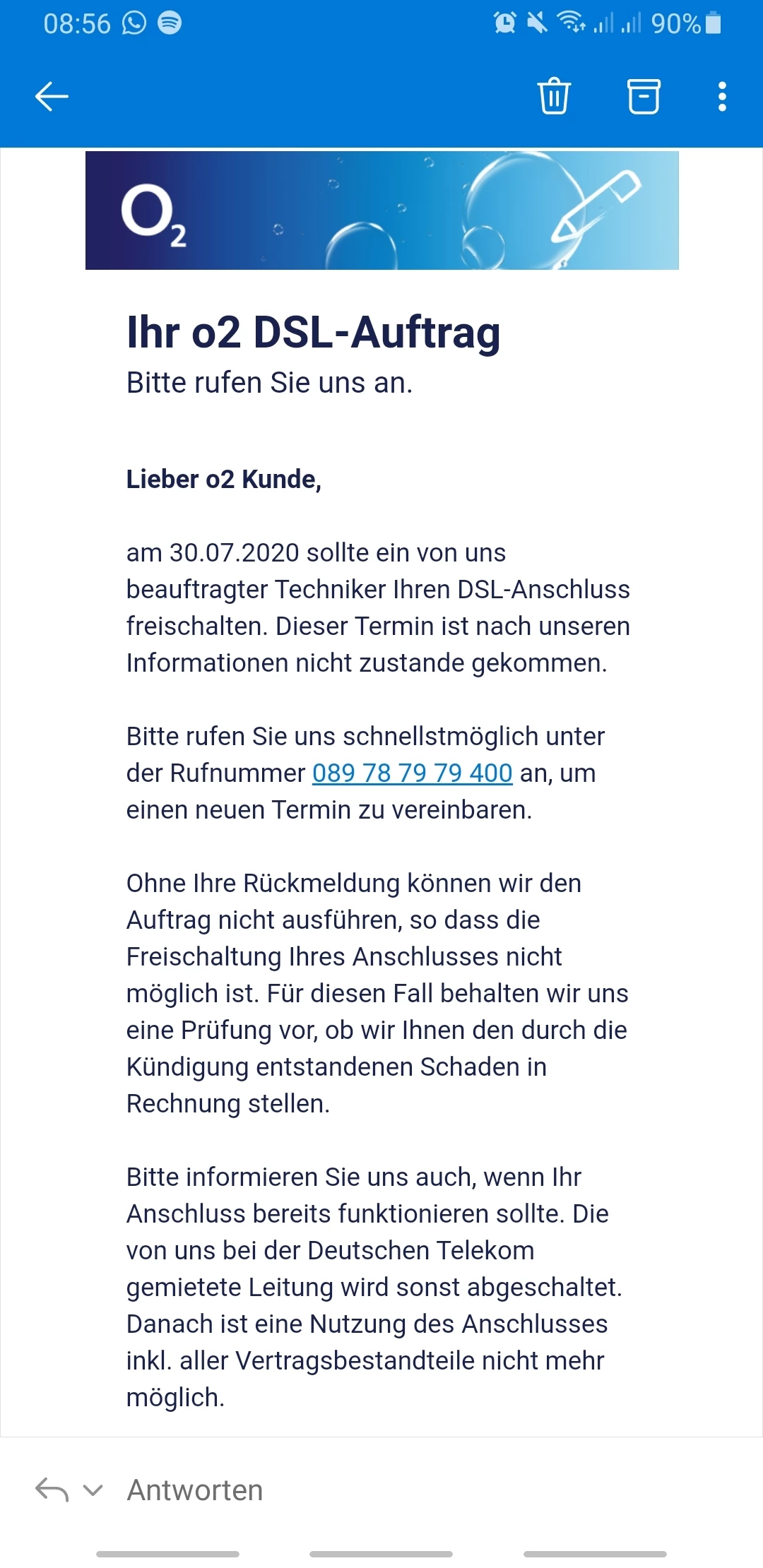 Ich bekomme schon zum zweiten Mal diese Mail, obwohl der Techniker schon längst da war. Hintergrund: die Kollegen der o2 hotline haben das falsche Stockwerk beim Auftrag eingetragen. Angeblich musste deshalb ein neuer Termin bei der Telekom beantragt werden (was laut dem Telekom Techniker überhaupt nicht nötig gewesen wäre.) Der alte Termin wurde also angeblich storniert, der neue Termin am 06.08. wurde ganz normal ausgeführt und trotzdem bekomme ich diese Mail. Kann bitte jemand kompetentes helfen, am Telefon hieß es nur "Wir kümmern uns" aber nichts ist passiert. ?