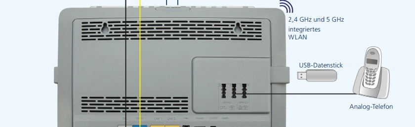 Beim Gigaset A400 handelt es sich um ein normales analoges Telefon mit Anrufbeantworter. Um es mit der o2 Homebox zu verbinden, steckt man den TAE-Stecker der Gigaset-Basis in die TAE-Buchse der o2 Homebox.