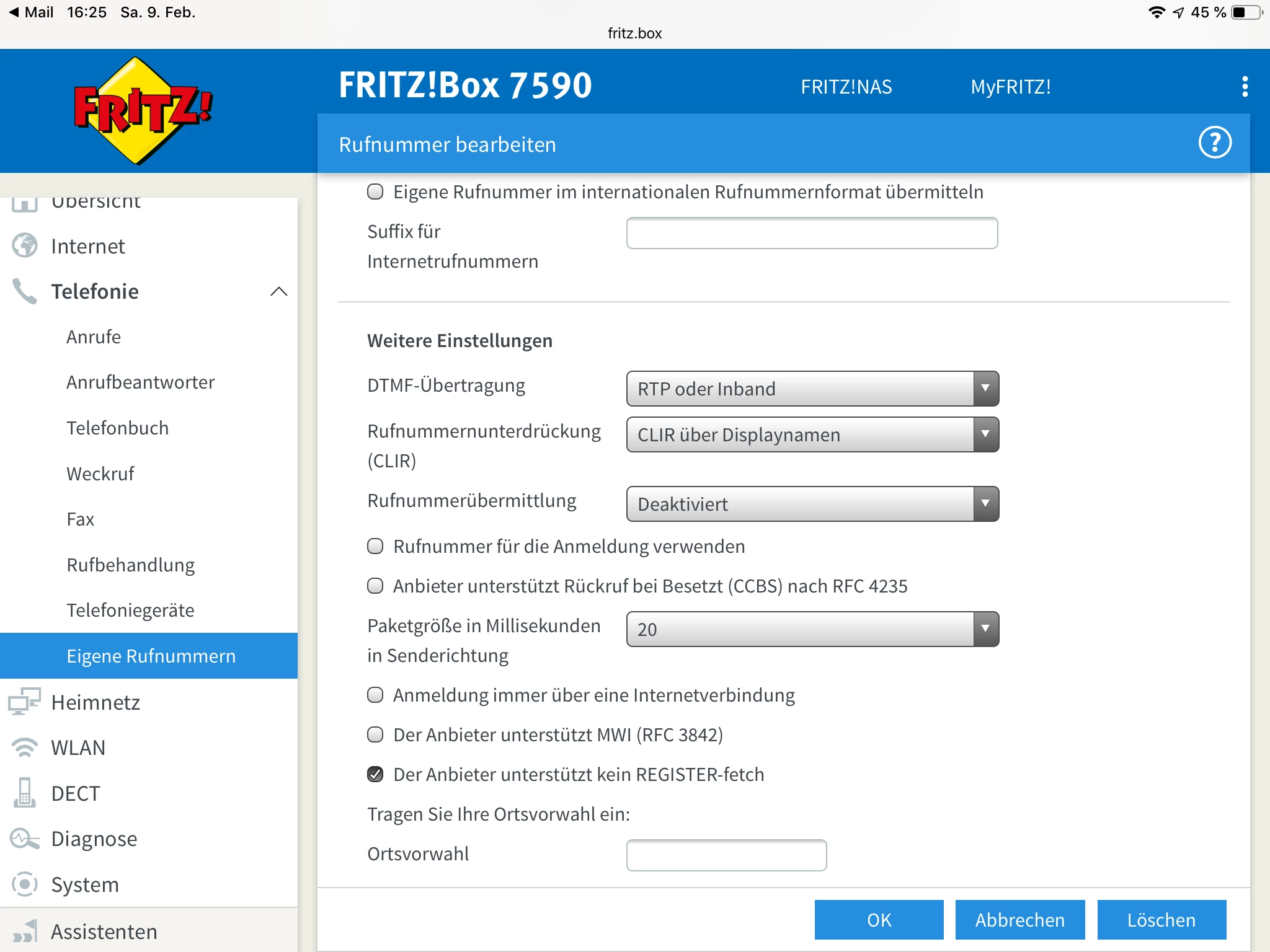 Die Rufnummer zu löschen und mit den gleichen Einstellungen (die ja schon mal funktioniert haben) wieder zu installieren hat auch nichts gebracht.