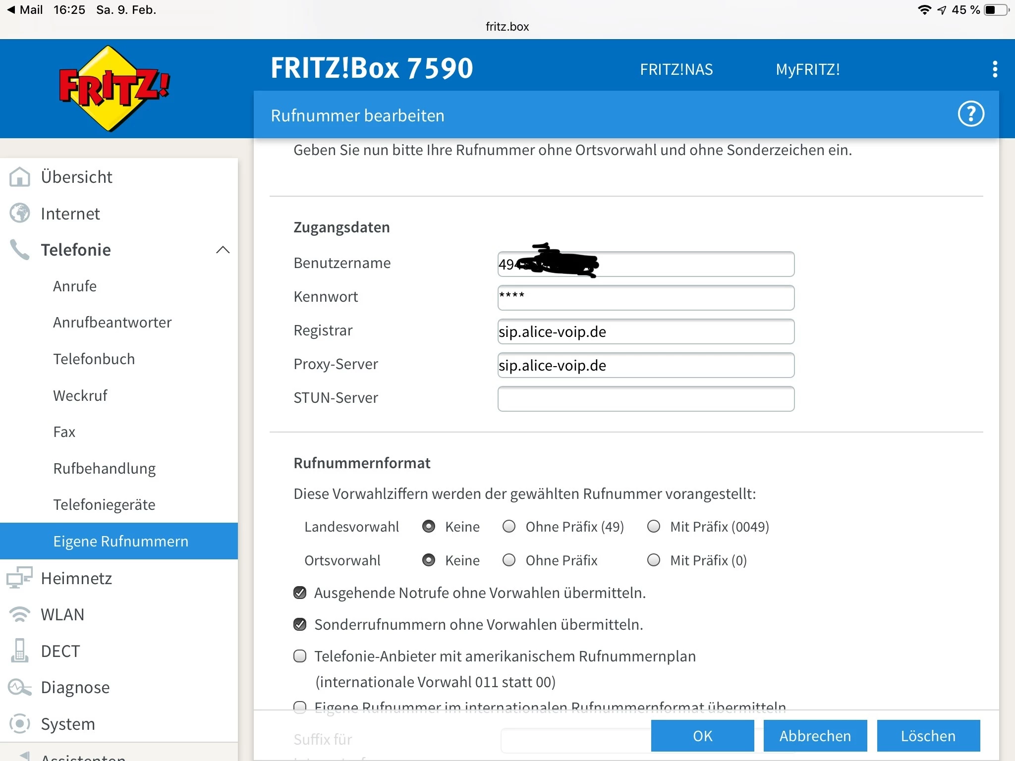 Die FritzBox zeigt meine Rufnummer als funktionierend an.