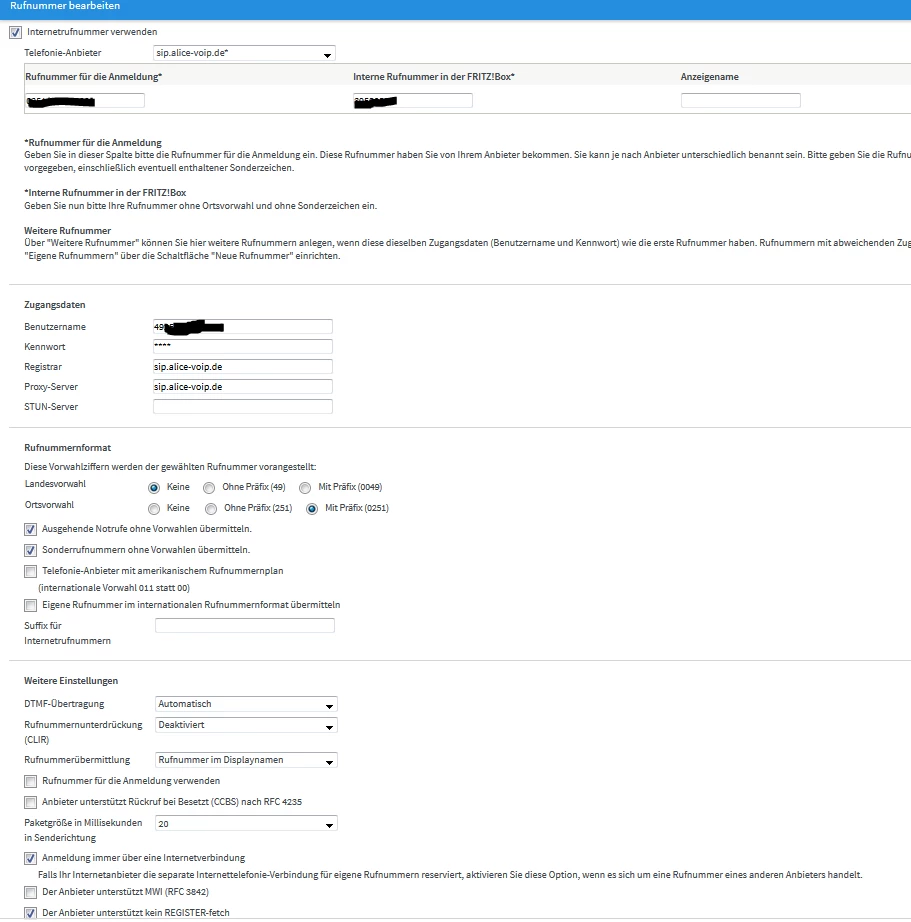 wichtig ist noch, die Fritzbox stellt unter Telefonie nur die Rufnummer bereit. Wenn dort alles eingerichtet ist, kann man trotzdem erst Telefonieren, wenn auch ein Telefoniegerät mit dieser Nummer verknüpft wird. Die Fritzbox kann das nicht erraten.
