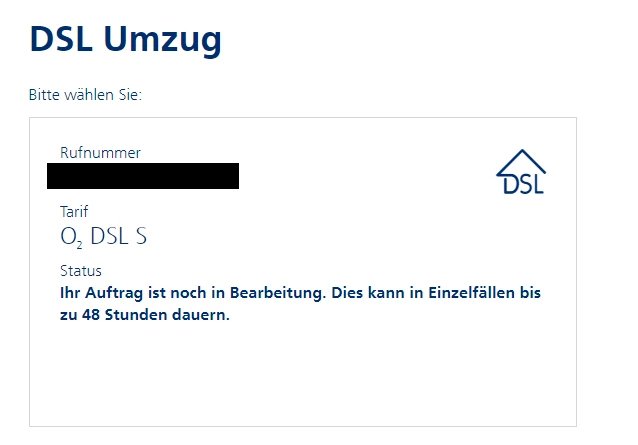 Hallo ich möchte nach meinem Umzug auch das DSL natürlich "mitnehmen". Leider steht bei mir seit über einer Woche bei "Vertrag verwalten --> Umzug" immer noch "Ihr Auftrag ist noch in Bearbeitung. Dies kann in Einzelfällen bis zu 48 Stunden dauern". Passiert hier noch was?