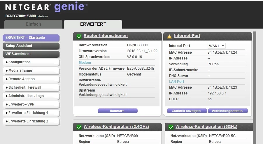 Als Modem/Router benutze ich Netgear DGND3800B.