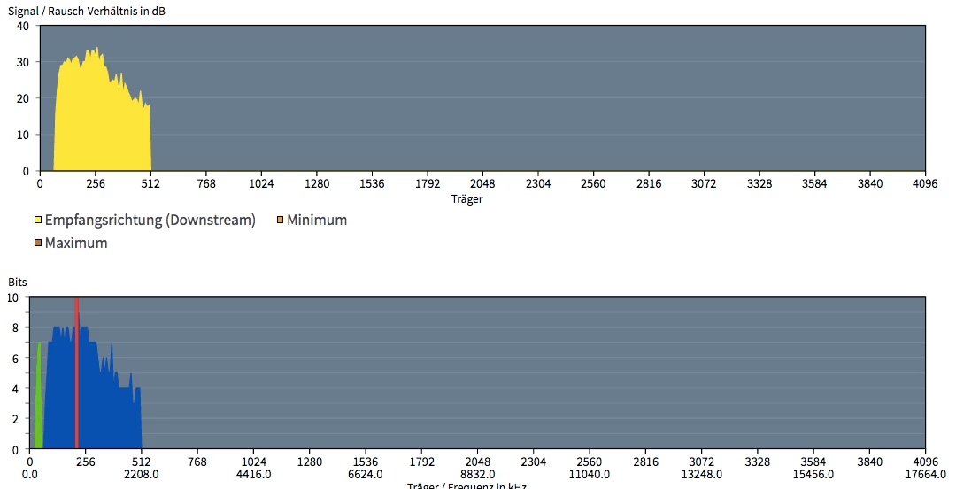 Und schliesslich sehe ich in den DSL-Spektrum-Informationen, dass der Frequenzbereich oberhalb von Traeger 512 bzw. 2.2 MHz abrupt aufhoert, was dafuer spricht, dass mein VDSL-Anschluss im "Vectoring Fallback"-Stoerprofil