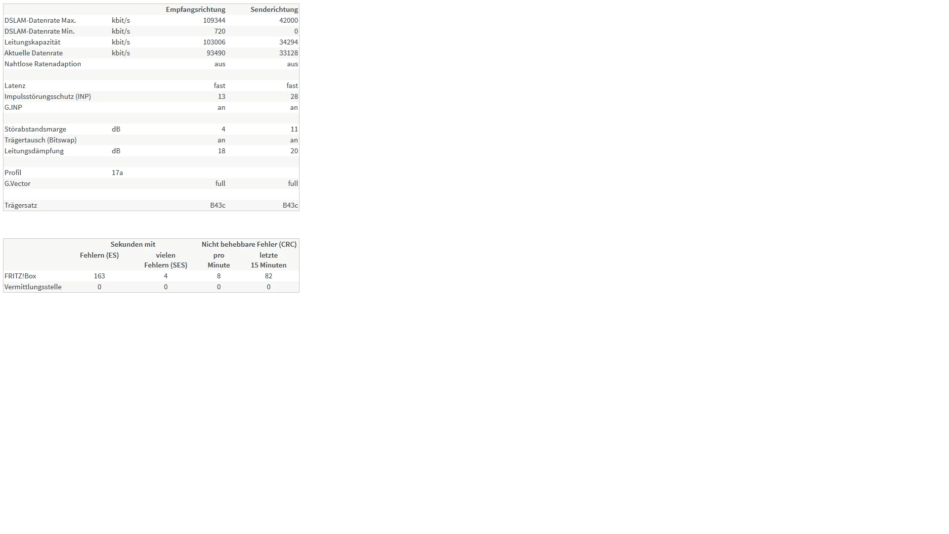 Wenn ich mir die aktuelle Datenrate, mit der die Fritz-Box die Verbindung ausgehandelt hat anschaue, sollten es aktuell 76.366 kbit/s downstream und 33.209 kbit/s upstream sein...