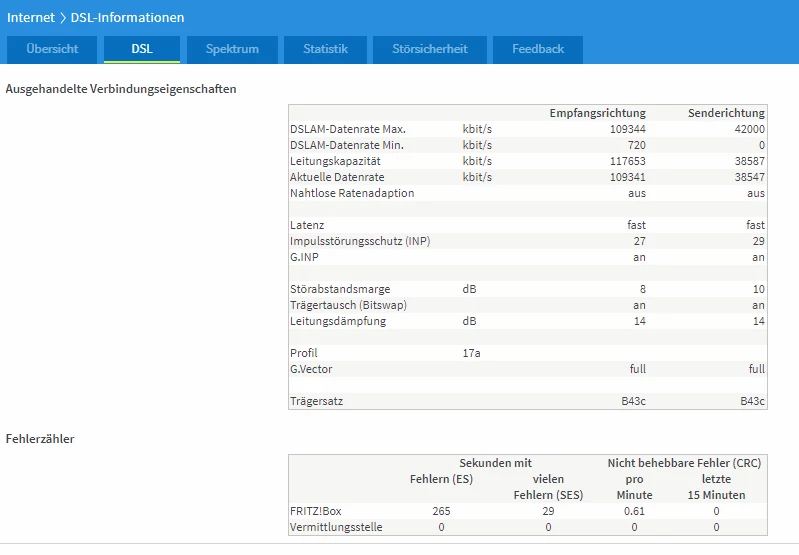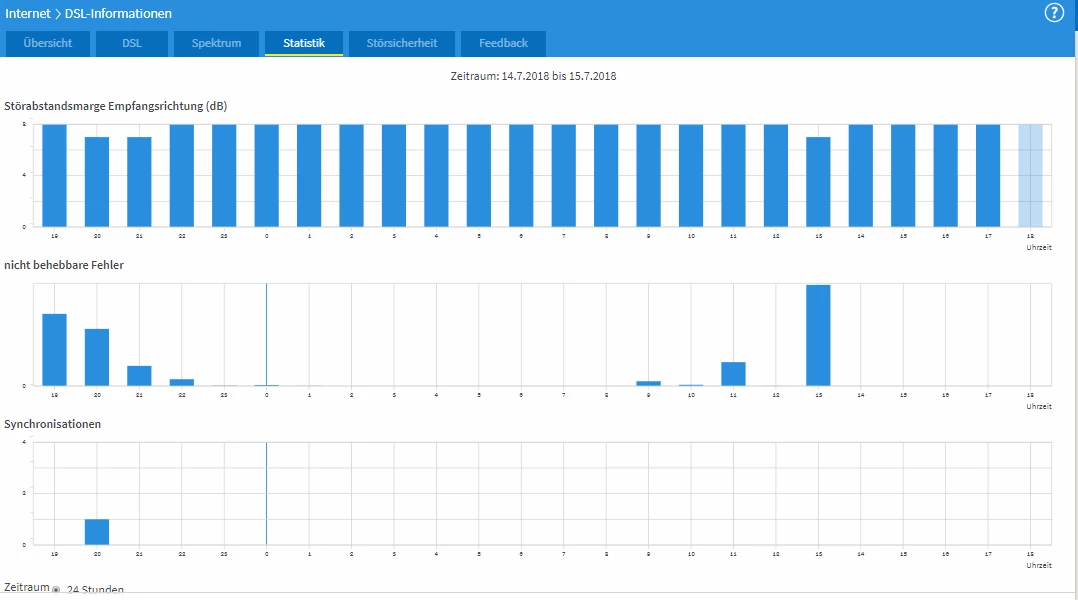 Ja da sind schon Fehler auf der Leitung. Bis jetzt hättest du noch keinen Verlust der Verbindung. Der letzte war gestern um 20 Uhr. Vermutlich weil der SNR einbricht. Nutzt du Powerline Produkte?