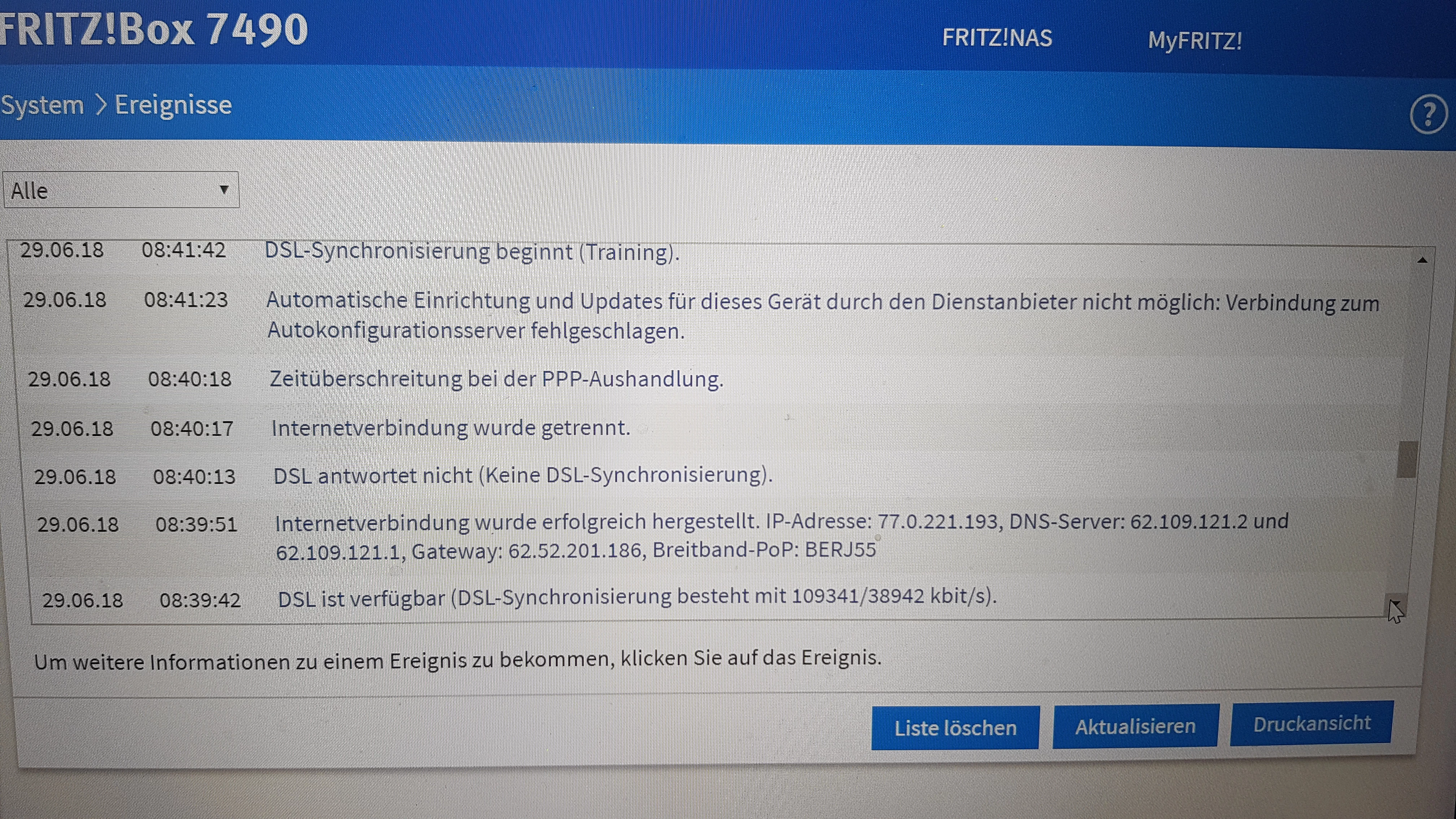 Seit gestern Nachmittag geht DSL nicht mehr. Die Fritzbox (meine eigene 1,5 Jahre alte 7490, neueste OS version) versucht sich alle paar Minuten mit der Gegenstelle zu synchronisieren. Das Training dauert ungewöhnlich lange - ca 2 Minuten . Dann habe ich für paar Sekunden (bis zu einer halben Minute) eine Verbindung und dann heißt es wieder "DSL antwortet nicht " und das Spiel geht von vorne los. Ab und zu sehe ich auch "Verbindung zum Autokonfigurationsserver kann nicht hergestellt werden".