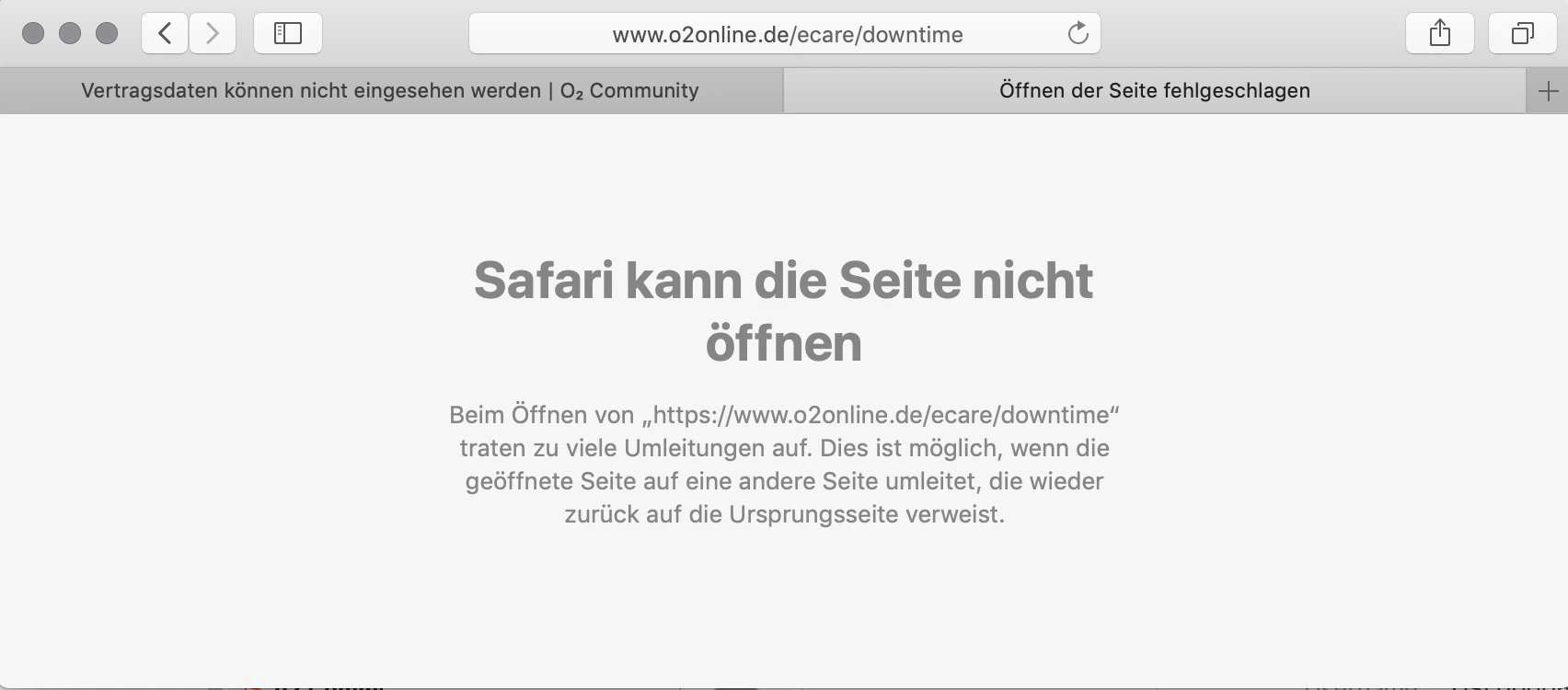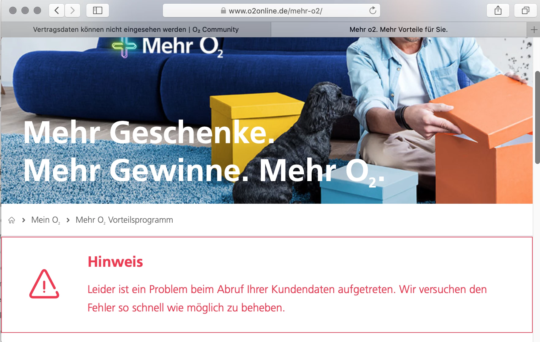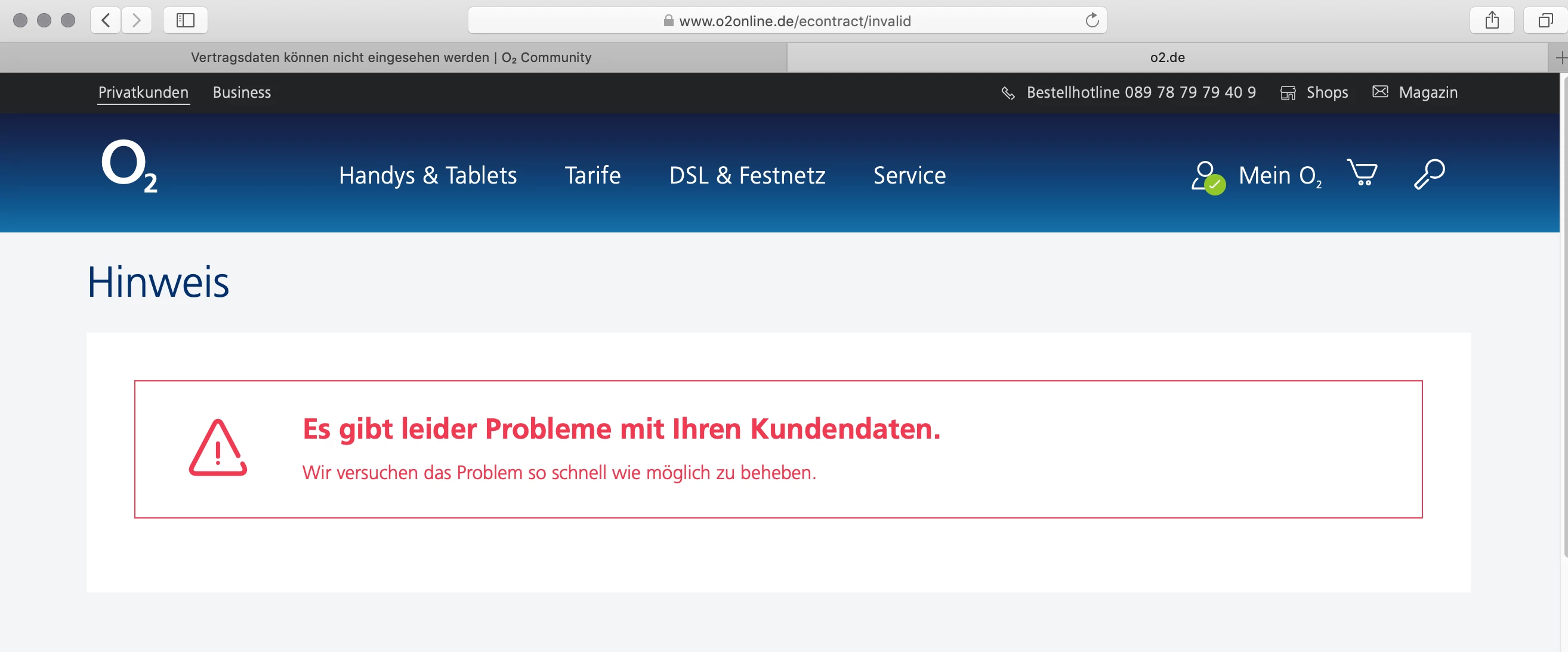 ich bin O2 DSL-Neukunde seit ca. 1 Monat. Der Login in "Mein O2" funktioniert mittlerweile, allerdings kann ich keinerlei Vertragsdaten einsehen. Sobald ich auf "Tarif & Vertrag" oder "Rechnung & Guthaben" oder "Meine Daten" klicke, wird der Browser (Internet Explorer, Chrome, ..) immer wieder refreshed, sodass die Seite nicht angezeigt werden kann.